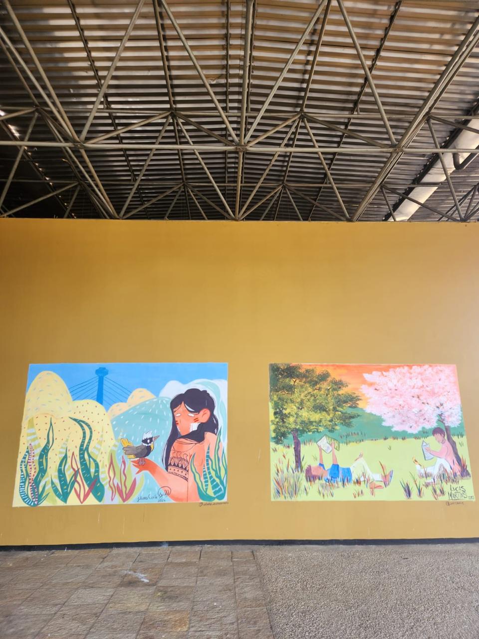 Em outubro de 2025, a Biblioteca Comunitária realiza mais uma edição da Semana Nacional do Livro e da Biblioteca (SNLB). Com o tema Arte em cada Canto, diversas atividades culturais compõem a programação do evento, dentre as quais destaca-se a entrega de dois painéis artísticos para a comunidade acadêmica, de autoria de alunos do curso de Artes Visuais da UFPI. Foto: BCCB, 2025. O primeiro painel, de autoria da discente Juliana Costa Carvalho, vencedora do concurso de pintura, em referência ao dia de Teresina, promovido pela Pró-Reitoria de Extensão e Cultura. O painel traz elementos característicos de Teresina, como o pássaro Bem-Ti-Vi, a planta espada de São Jorge, os tons quentes em referência ao calor de Teresina, dentre outros elementos que caracterizam a nossa cidade. Para Juliana, sua obra representa a própria universidade, a cidade de Teresina e a biblioteca, unindo cultura, educação e arte visual. Foto: BCCB, 2025. O segundo painel, de autoria do discente Lucas Martins Sousa, foi construído exclusivamente para a SNLB 2025. Traz vários elementos presentes dentro da UFPI como as árvores e os estudantes que aproveitam os espaços da Biblioteca para leitura e entretenimento. Para Lucas, ter o seu trabalho artístico retratado em um espaço de grande circulação, como o hall externo da Biblioteca é uma grande satisfação e um incentivo para seguir produzindo. As atividades da SNLB acontecem de 28 de outubro a 04 de novembro em múltiplos espaços da BCCB e Rosa dos Ventos.