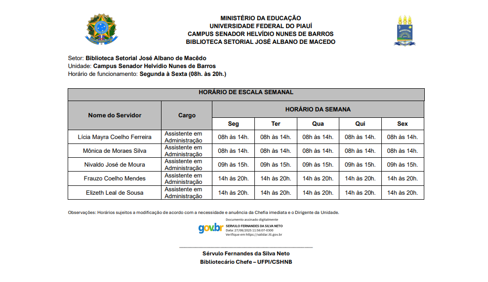De acordo com a Resolução Nº 063/2019 - CAD/UFPI, que estabelece os critérios e as condições para a adoção da flexibilização da jornada de trabalho dos servidores técnico-administrativos em educação, no âmbito da Universidade Federal do Piauí, e conforme a solicitação mediante processo aberto pela chefia imediata dos setores, conforme análise e parecer da Comissão de Flexibilização de Jornada de Trabalho da Universidade Federal do Piauí (UFPI) e Ato da Reitoria, a direção do Campus Senador Helvídio Nunes de Barros (CSHNB) por meio da Divisão de Recursos Humanos (DRH) disponibiliza o horário de funcionamento dos setores com jornada flexibilizada com o respectivo servidor responsável pelo atendimento ao público:
