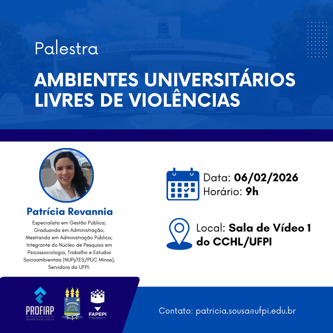 A Coordenação do Mestrado Profissional em Administração Pública da Universidade Federal do Piauí (PROFIAP/UFPI) promove, no dia 6 de fevereiro de 2026, a palestra “Ambientes Universitários Livres de Violências”, que tem como objetivo discutir as diferentes manifestações de violência no contexto acadêmico. A atividade ocorrerá às 9h, na Sala de Vídeo 1 do Centro de Ciências Humanas e Letras (CCHL/UFPI).