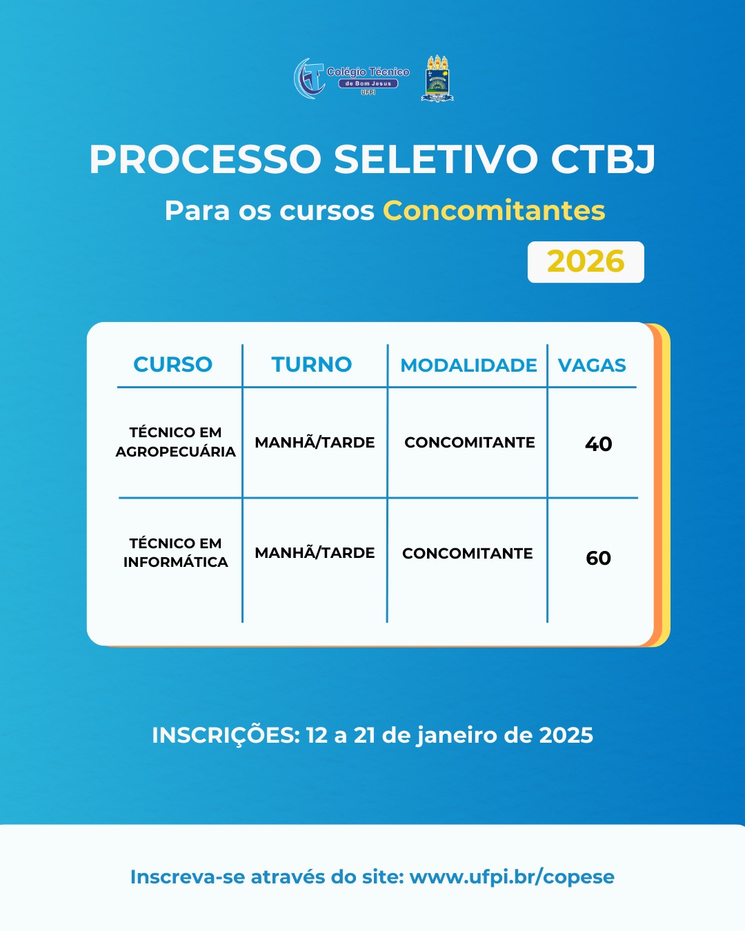 O Colégio Técnico de Bom Jesus (CTBJ) publicou o edital do processo seletivo para ingresso nos cursos técnicos concomitantes, modalidade que possibilita ao estudante cursar, de forma simultânea, o Ensino Médio e a formação técnica. Ao todo, estão sendo ofertadas 100 vagas, distribuídas entre os cursos de Técnico em Agropecuária, com 40 vagas, e Técnico em Informática, com 60 vagas. A seleção dos candidatos será realizada exclusivamente por meio da Análise das notas de Língua Portuguesa e Matemática do 9º ano do Ensino Fundamental, conforme os critérios estabelecidos no edital. As inscrições estarão abertas no período de 12 a 21 de janeiro de 2026, com prazo para pagamento da taxa de inscrição até 22 de janeiro de 2026. O resultado final do processo seletivo está previsto para o dia 4 de fevereiro de 2026. A taxa de inscrição é de R$ 30,00 para candidatos da ampla concorrência e de R$ 15,00 para candidatos que cursaram integralmente o Ensino Fundamental em escola pública. Conforme previsto no edital, 80% das vagas são destinadas a estudantes da rede pública de ensino, incluindo reserva de vagas para candidatos de baixa renda, pretos, pardos, indígenas, quilombolas e pessoas com deficiência, respeitando a legislação vigente. O edital completo, contendo todas as informações sobre o processo seletivo, documentação exigida e critérios de classificação, está disponível no site da COPESE/UFPI. Clique aqui para acessar o Edital completo
