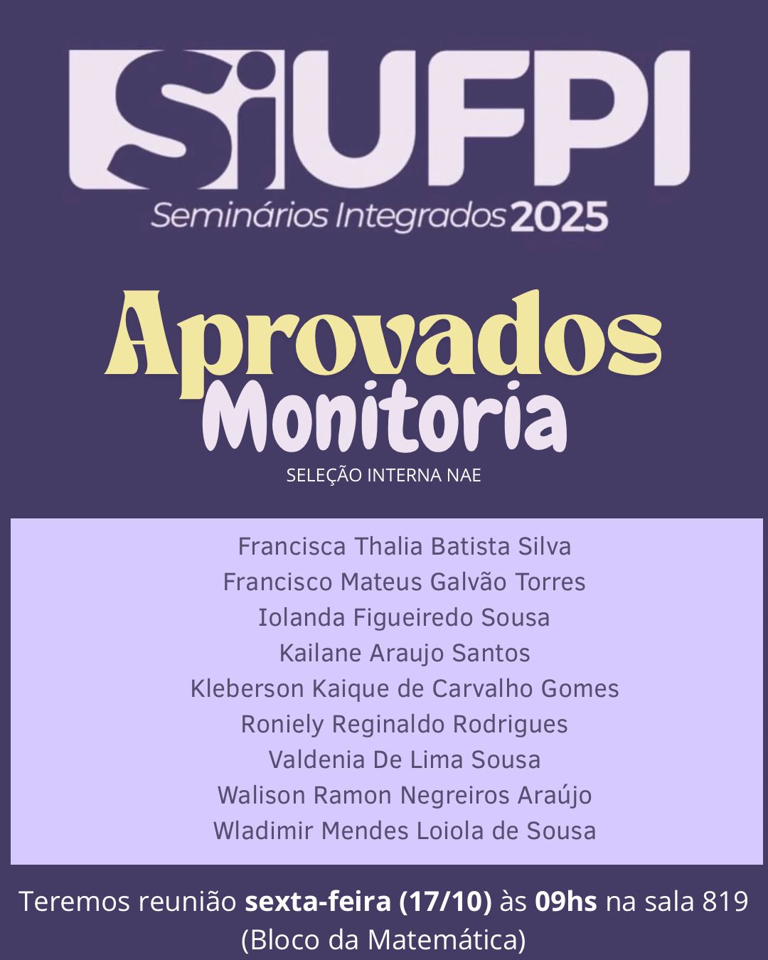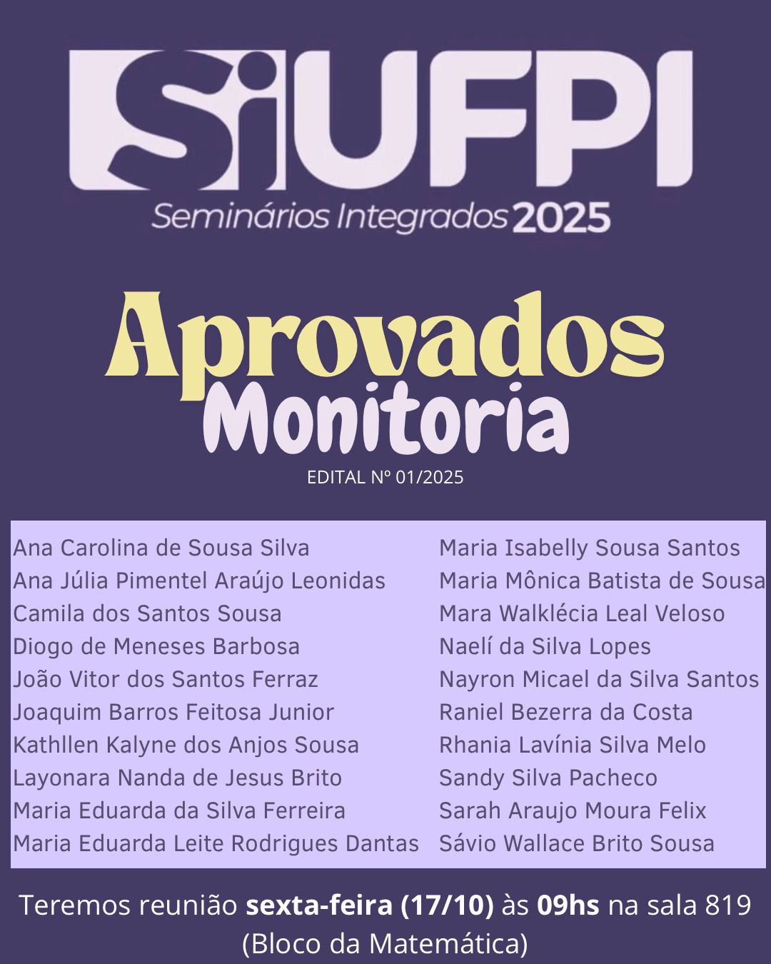 A coordenação do evento informa que todos os candidatos selecionados estão convocados para uma reunião presencial nesta quinta-feira, 17 de outubro, a ser realizada na sala 819, localizada no Bloco da Matemática.