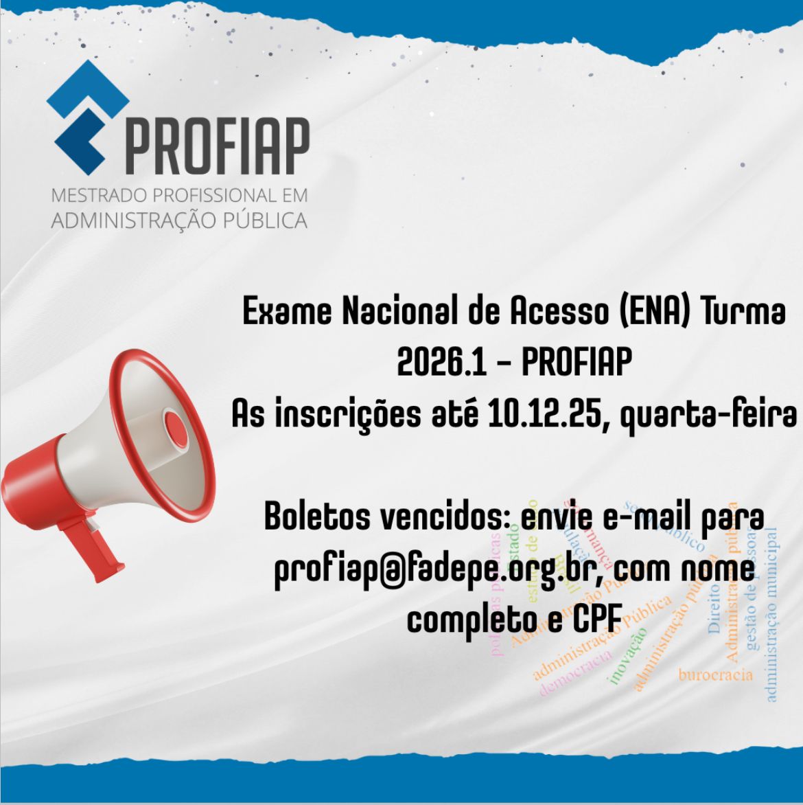 O Programa de Mestrado Profissional em Administração Pública da Universidade Federal do Piauí (PROFIAP/UFPI), reforça aos interessados que o período de inscrições para o Exame Nacional de Acesso (ENA) Turma 2026.1, regido pelo Edital PROFIAP nº 23/2025, encerra no dia 10 de dezembro de 2025. Acesse aqui.