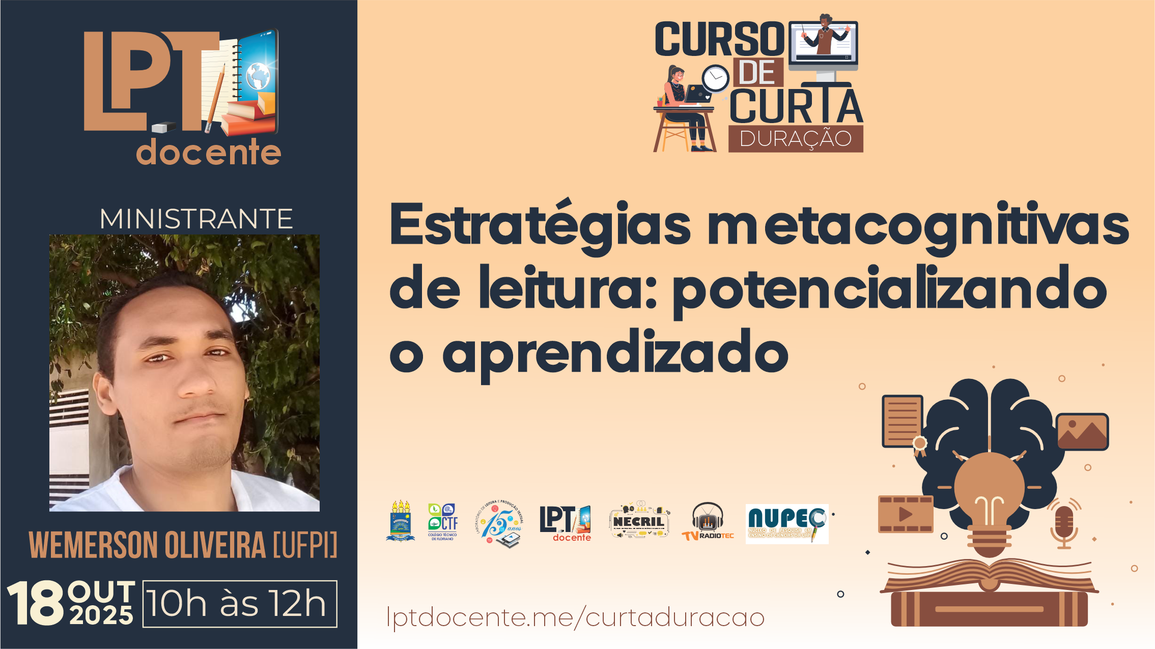 Já o curso Estratégias metacognitivas de leitura: potencializando o aprendizado objetiva contribuir para melhorar a proficiência leitora de estudantes e professores, por meio da compreensão e aplicação de estratégias metacognitivas de leitura e será ministrado pelo professor e estudante de doutorado Wemerson Vieira de Oliveira (UFPI), em turma única e com vagas ilimitadas. As atividades serão realizadas no canal da TV Radiotec no YouTube, conforme dia e horário descritos no cartaz a seguir:
