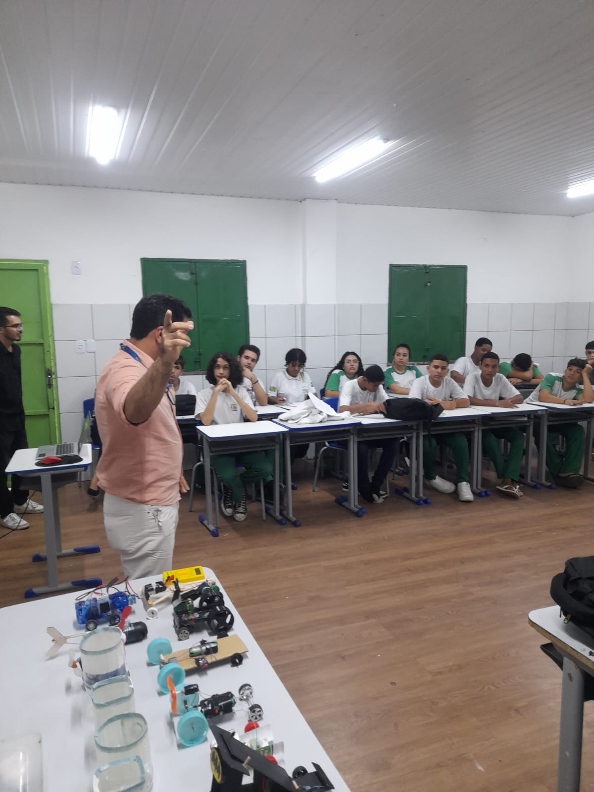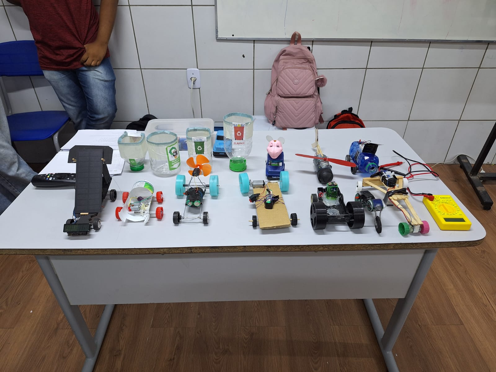 Foram mostrados alguns materiais utilizados (garrafas PET, palitos, papelão, tampas, motores, fios, pilhas, entre outros) e protótipos de carrinhos já construídos, tornando a explicação mais visual e atrativa.
