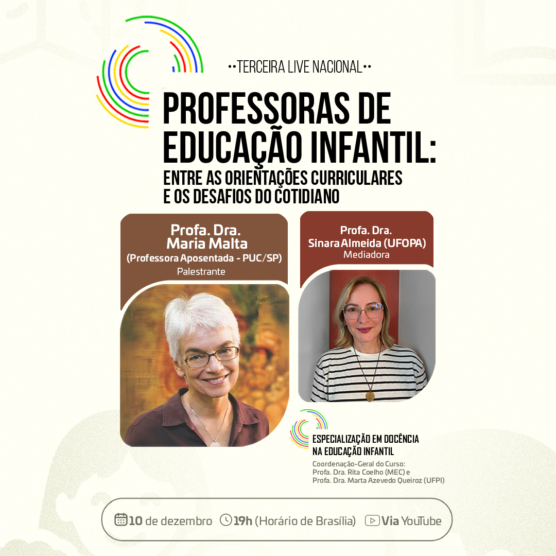 No dia 10 de dezembro, acontecerá a terceira live nacional do curso de Especialização em Docência Infantil do CEAD/UFPI, com o tema “Professoras de Educação Infantil: Entre as Orientações Curriculares e os Desafios do Cotidiano”. A palestra será ministrada pela Profa. Dra. Ana Maria Malta, professora aposentada da PUC-SP, referência na área de Educação Infantil.