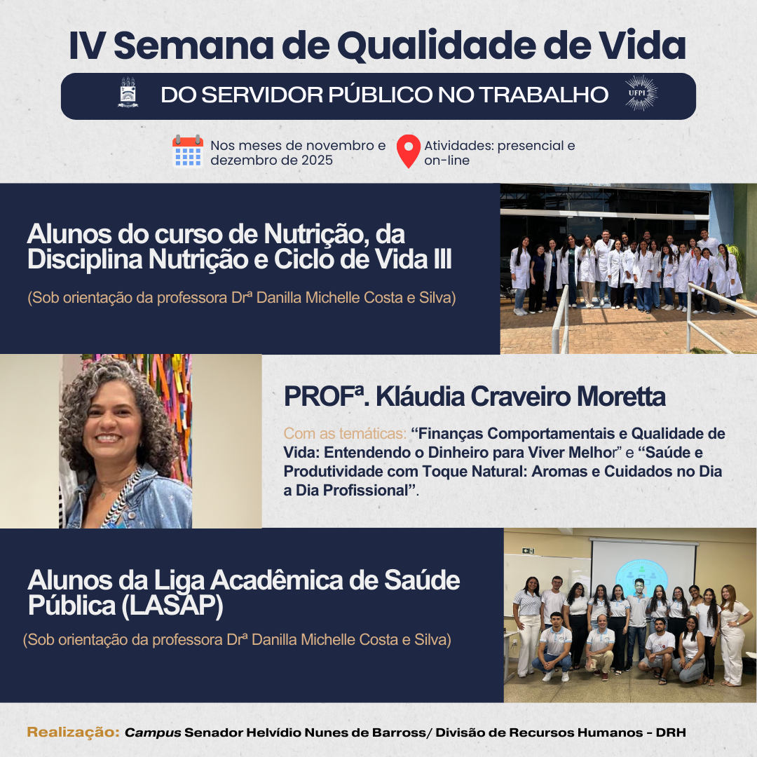 O Campus Senador Helvídio Nunes de Barros (CSHNB/UFPI), em Picos, realiza a IV Semana de Qualidade de Vida no Trabalho do Servidor Público, evento que tem como objetivo promover diálogos e atividades práticas voltadas à Qualidade de Vida no Trabalho (QVT) de servidores públicos — docentes e técnico-administrativos — além de alunos e membros da comunidade externa. A iniciativa integra as ações de Desenvolvimento Institucional da UFPI, com foco no bem-estar e na promoção de um ambiente de trabalho mais saudável. A atividade é organizada pela Divisão de Recursos Humanos (DRH) do CSHNB e contribui para o fortalecimento do Programa de Qualidade de Vida no Trabalho (QVT) da instituição. As inscrições já estão abertas e seguem até 1º de dezembro. Os interessados devem realizar o cadastro por meio do SIGAA, acessando: SIGAA > Extensão > Acesso à área de inscritos em Cursos e Eventos. Ao todo, serão disponibilizadas 80 vagas, destinadas ao público interno (docentes, discentes e técnicos) e também à comunidade externa. O evento acontecerá nos meses de novembro e dezembro de 2025. A programação tem início no dia 24 de novembro, das 8h às 12h, com uma exposição no pátio central da UFPI. A atividade será conduzida pelos alunos do curso de Nutrição, da disciplina Nutrição e Ciclo de Vida III, com a temática “Como superar os obstáculos para uma alimentação saudável”, sob orientação da professora doutora Danilla Michelle Costa e Silva. Alunos do curso de Nutrição No dia 1º de dezembro de 2025, será realizada uma palestra on-line, das 10h às 11h, com o tema “Finanças Comportamentais e Qualidade de Vida: Entendendo o Dinheiro para Viver Melhor”. A atividade será ministrada pela professora mestre Kláudia Craveiro Moretta, do curso de Matemática. O link de acesso será enviado aos participantes por meio do SIGAA. Professora Kláudia Craveiro No dia 3 de dezembro de 2025, das 8h às 12h, será realizada uma exposição no pátio central da UFPI, conduzida pelos alunos da Liga Acadêmica de Saúde Pública (LASAP). A atividade terá como tema “Estratégias para aliviar o estresse em trabalhadores", sob orientação da professora doutora Danilla Michelle Costa e Silva. Liga Acadêmica de Saúde Pública (LASAP) Encerrando a IV Semana de Qualidade de Vida no Trabalho do CSHNB/UFPI, no dia 4 de novembro de 2025, será realizada uma palestra on-line, das 10h às 11h, com o tema “Saúde e Produtividade com Toque Natural: Aromas e Cuidados no Dia a Dia Profissional”. A atividade será ministrada pela professora mestre Kláudia Craveiro Moretta, do curso de Matemática. O link de acesso será enviado aos participantes por meio do SIGAA. A execução do Evento “IV Semana de Qualidade de Vida no Trabalho do Servidor Público - CSHNB”, envolverá uma articulação entre ensino, pesquisa e extensão na medida em que os diálogos e práticas ocorridas nos encontros promoverão um despertar da relação entre alimentação, cuidado pessoal e saúde, tendo como foco central a Qualidade de Vida no Trabalho (QVT), uma das metas do Plano de Desenvolvimento da Unidade (PDI) do CSHNB.