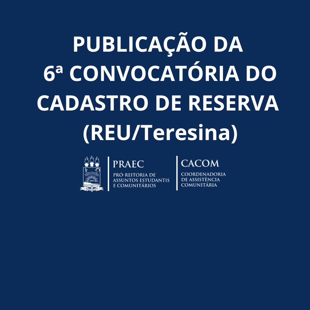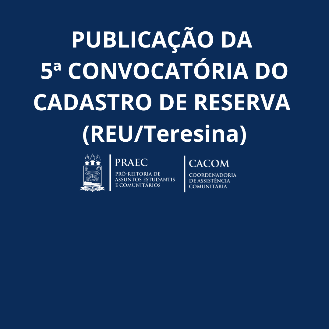 A Universidade Federal do Piauí (UFPI), por meio da Pró-Reitoria de Assuntos Estudantis e Comunitários (PRAEC), da Coordenadoria de Assistência Comunitária (CACOM) e do Serviço Social (SES), divulga a QUINTA CONVOCATÓRIA DO CADASTRO DE RESERVA (vagas masculinas) do benefício Residência Universitária (REU) do Campus Ministro Petrônio Portella (CMPP) - Campus Teresina, previsto no Edital N° 05/2025 – PRAEC/UFPI.