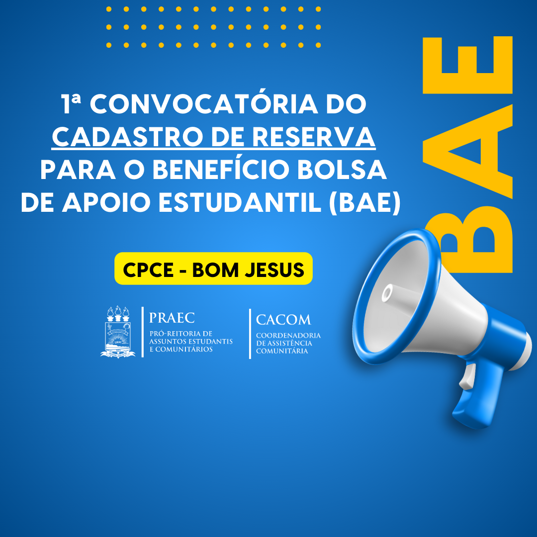 A Universidade Federal do Piauí, por meio da Pró-Reitoria de Assuntos Estudantis e Comunitários (PRAEC), da Coordenadoria de Assistência Comunitária (CACOM) e do Núcleo de Assistência Estudantil (NAE), divulga a PRIMEIRA CONVOCATÓRIA DO CADASTRO DE RESERVA da seleção para o benefício Bolsa de Apoio Estudantil (BAE) do Campus Professora Cinobelina Elvas - CPCE, previsto no Edital N° 09/2025 – PRAEC/UFPI.