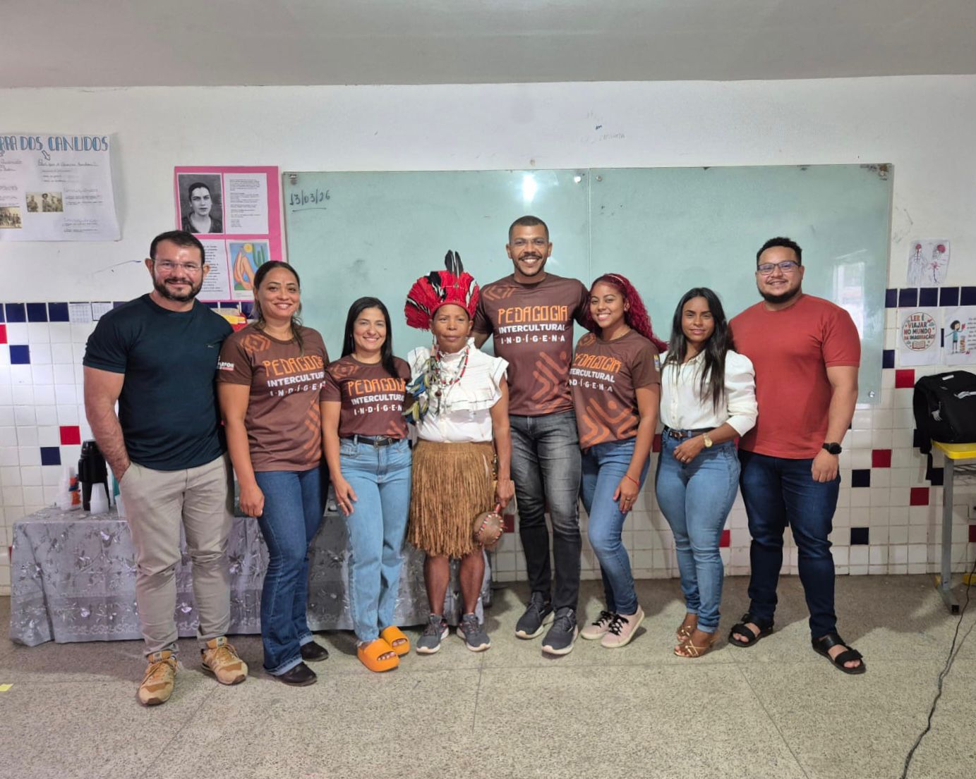 Turma de Pedagogia Intercultural Indígena de Uruçuí com coordenador do curso, professor formador e liderança indígena
