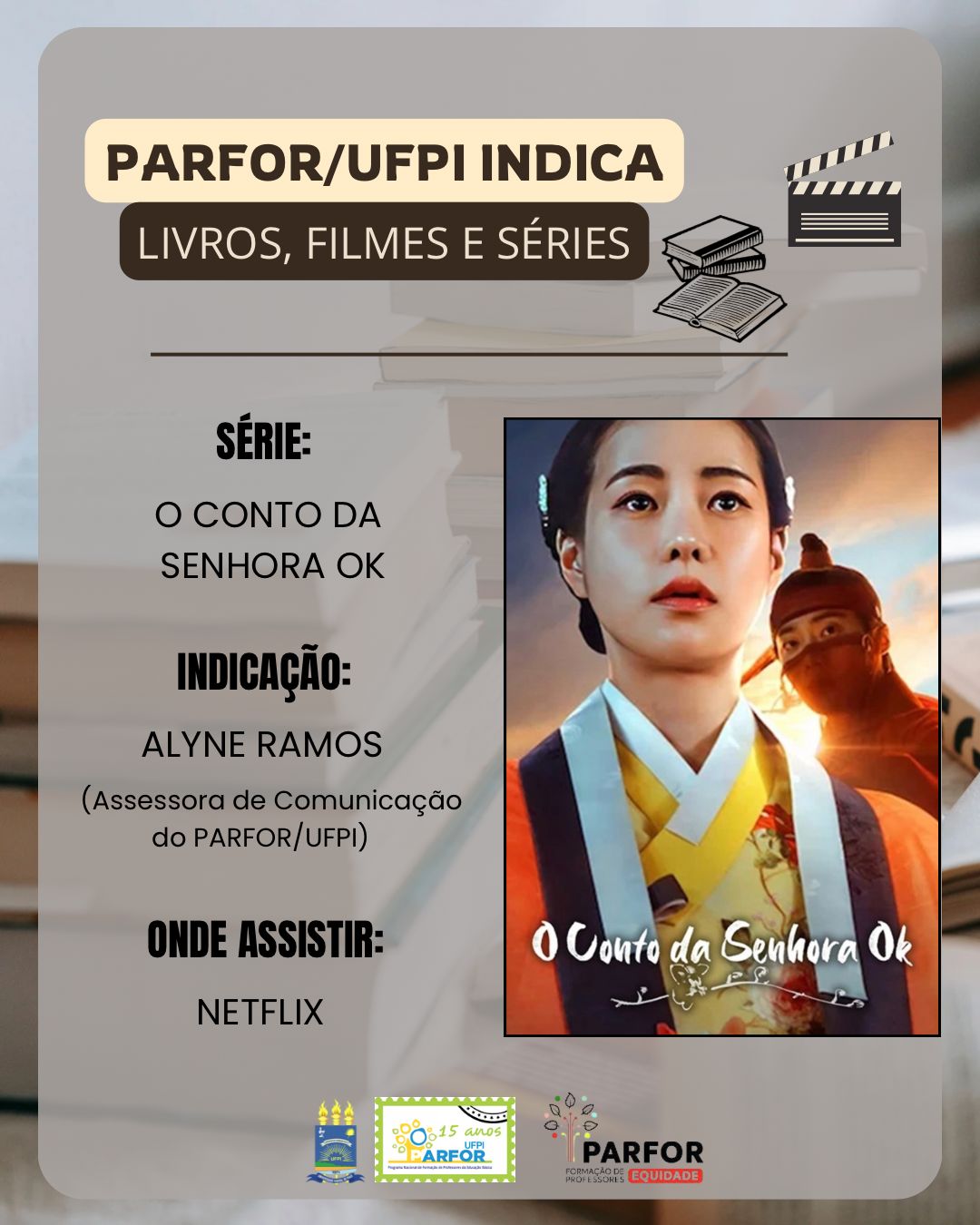 E hoje, trazemos a indicação de Alyne Ramos, Assessora de Comunicação do PARFOR/UFPI. Trata-se da série “O Conto da Senhora Ok”, drama histórico/romance sul-coreano, lançado em 2024.