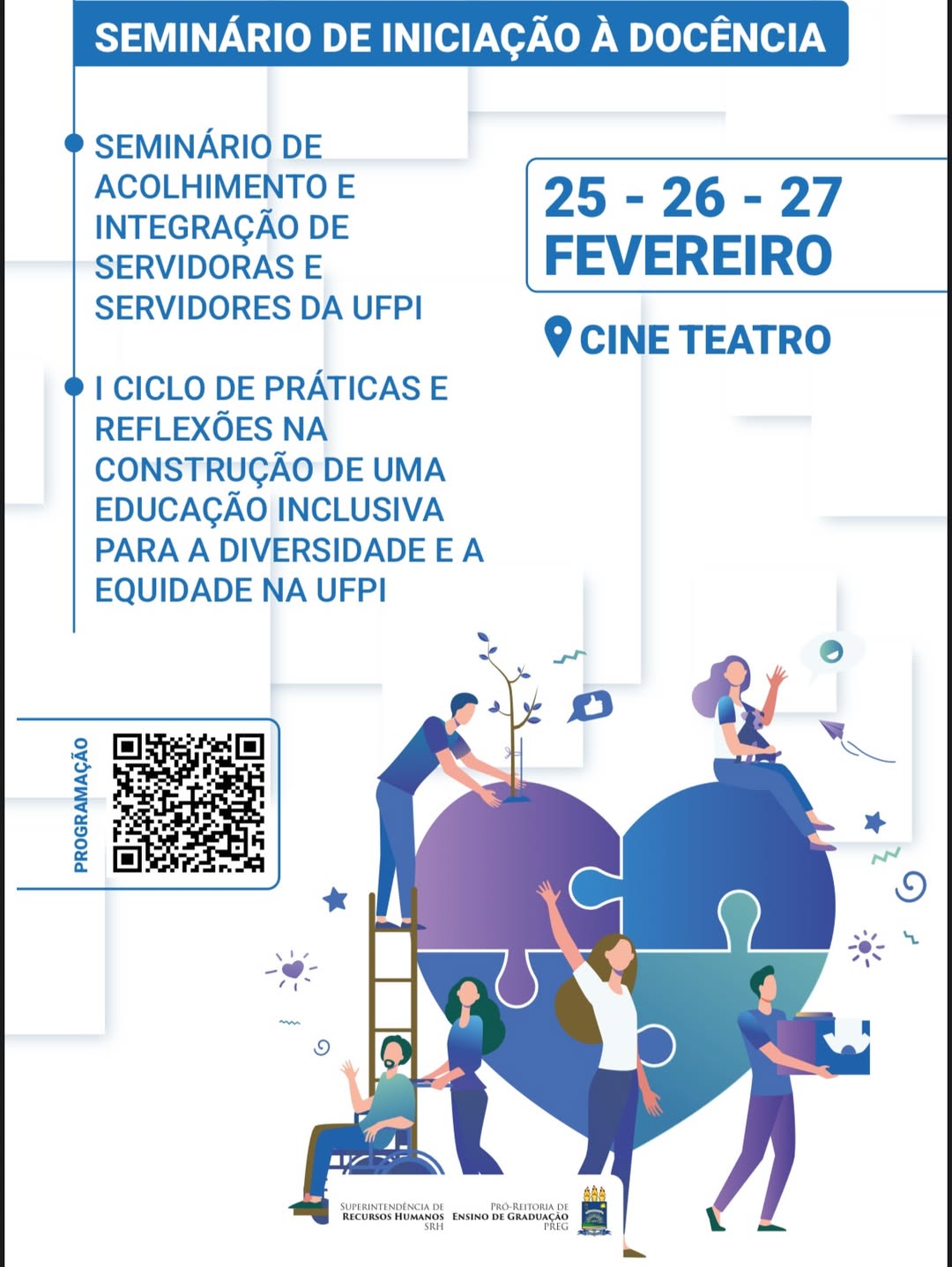 A Universidade Federal do Piauí (UFPI), por meio da Pró-Reitoria de Ensino de Graduação (PREG) e da Superintendência de Recursos Humanos (SRH), realiza nos dias 25, 26 e 27 de fevereiro os eventos “Seminário de iniciação a docência", o "Seminário de acolhimento e integração de servidoras e servidores da UFPI” e o "I Ciclo de práticas e reflexões na construção de uma Educação inclusiva para a diversidade e a equidade na UFPI".
