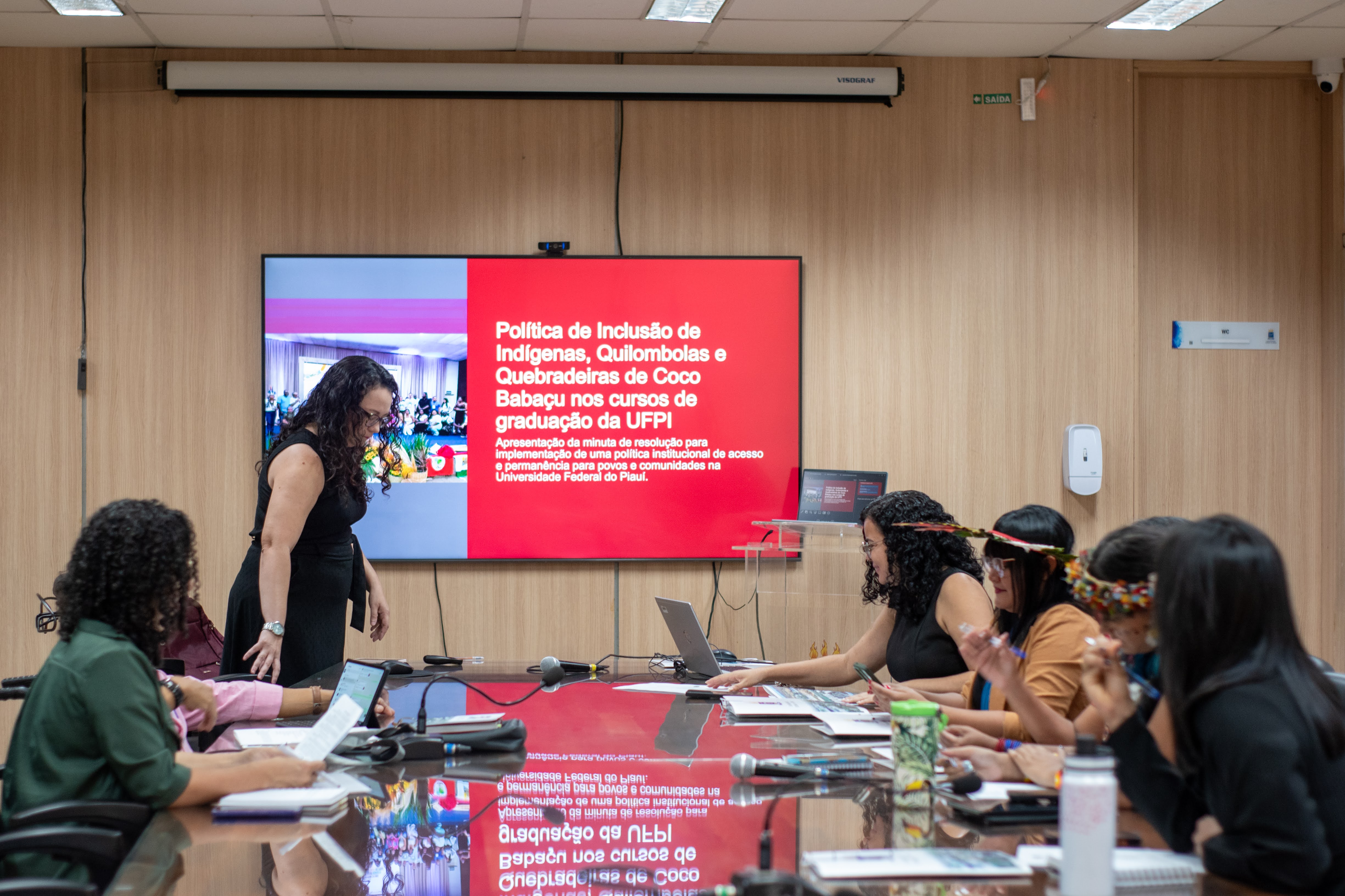 A Universidade Federal do Piauí (UFPI) concluiu nessa terça-feira (7/10) um ciclo de reuniões com comunidades para apresentar e dialogar sobre a minuta de Resolução da Política de Inclusão de Indígenas, Quilombolas e Quebradeiras de Coco Babaçu nos cursos de graduação presencial da Instituição. O encontro da terça ocorreu no Salão Nobre da Reitoria, de forma híbrida, entre representantes das Pró-Reitorias de Ensino de Graduação (Preg) e Assuntos Estudantis e Comunitários (Praec) e da Associação dos Docentes da UFPI (Adufpi) com representantes de populações dos quilombo mimbó, em Amarante, e Tapuio, em  Queimada Nova. Anteriormente, a Universidade já havia promovido encontros com representações indígenas e de quebradeiras de coco.