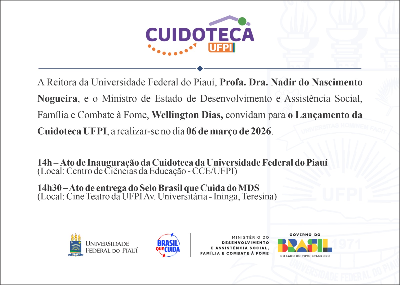 A Universidade Federal do Piauí (UFPI) e o Ministério do Desenvolvimento e Assistência Social, Família e Combate à Fome (MDS) inauguram nesta sexta-feira (6), às 14h, a segunda Cuidoteca do país. O espaço inovador é voltado ao cuidado e ao desenvolvimento de crianças, além de oferecer apoio a famílias em situação de vulnerabilidade. A cerimônia de inauguração contará com a presença da reitora Nadir Nogueira, do ministro do MDS, Wellington Dias, e do ministro da Secretaria-Geral da Presidência da República, Guilherme Boulos.