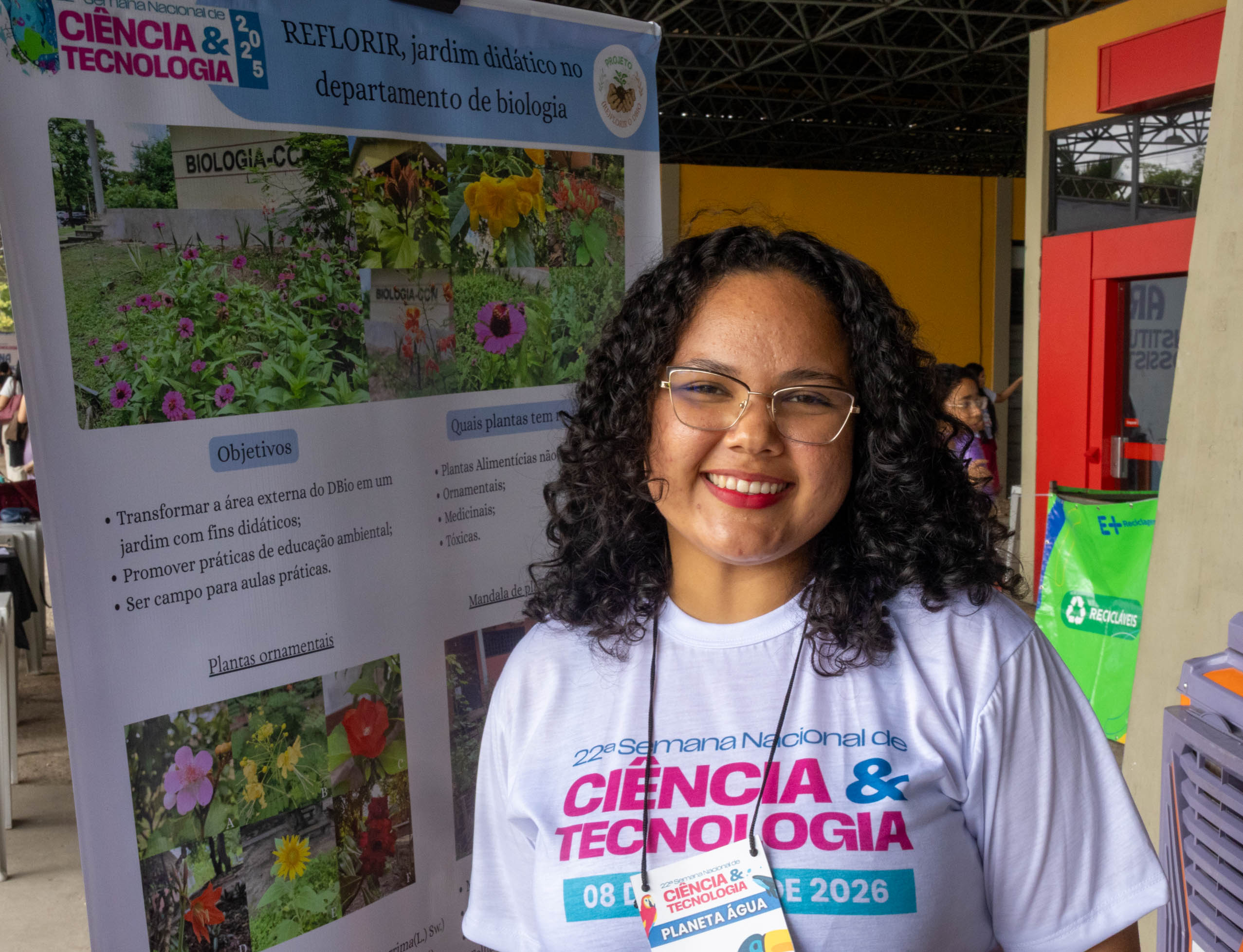 Entre os destaques, estudantes apresentaram projetos desenvolvidos na Universidade. A estudante Letícia Magalhães, do curso de Biologia, apresentou o projeto “Reflorir”, voltado à criação de um espaço com plantas medicinais, ornamentais, alimentícias não convencionais e tóxicas para uso didático.
