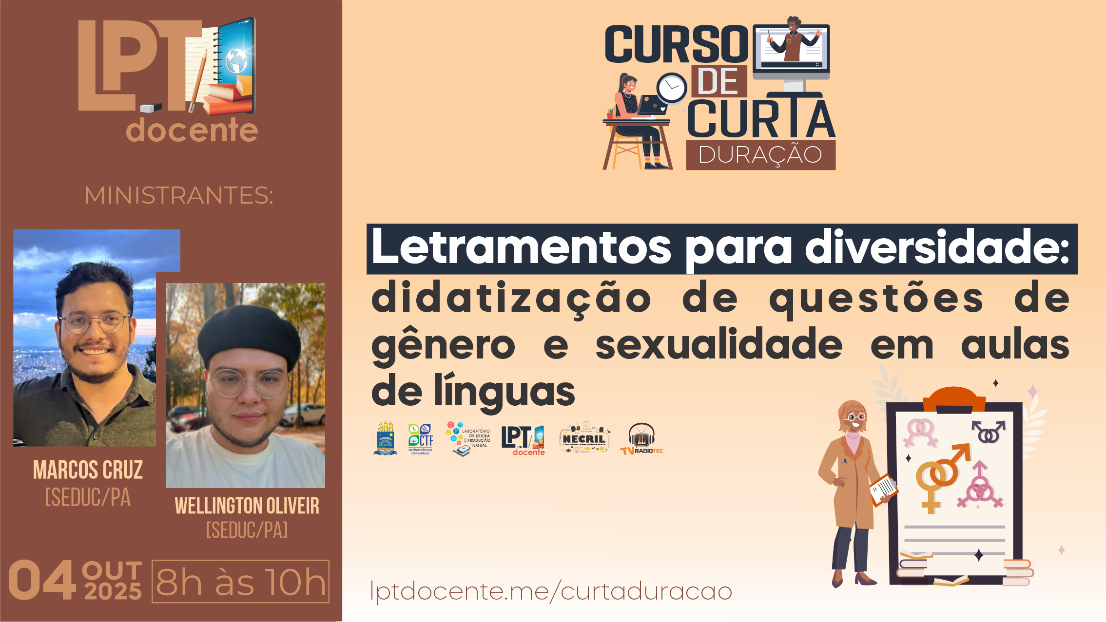 O curso Letramentos para diversidade: didatização de questões de gênero e sexualidade em aulas de línguas objetiva analisar dimensões teórico-metodológicas e didáticas implicadas na abordagem de questões de gênero e sexualidade em aulas de línguas e será ministrado pelos professores Marcos Cruz (SEDUC/PA) e Wellington Oliveira (SEDUC/PA), em turma única e com vagas ilimitadas. As atividades serão realizadas no canal da TV Radiotec no YouTube, conforme dia e horário descritos no cartaz a seguir: