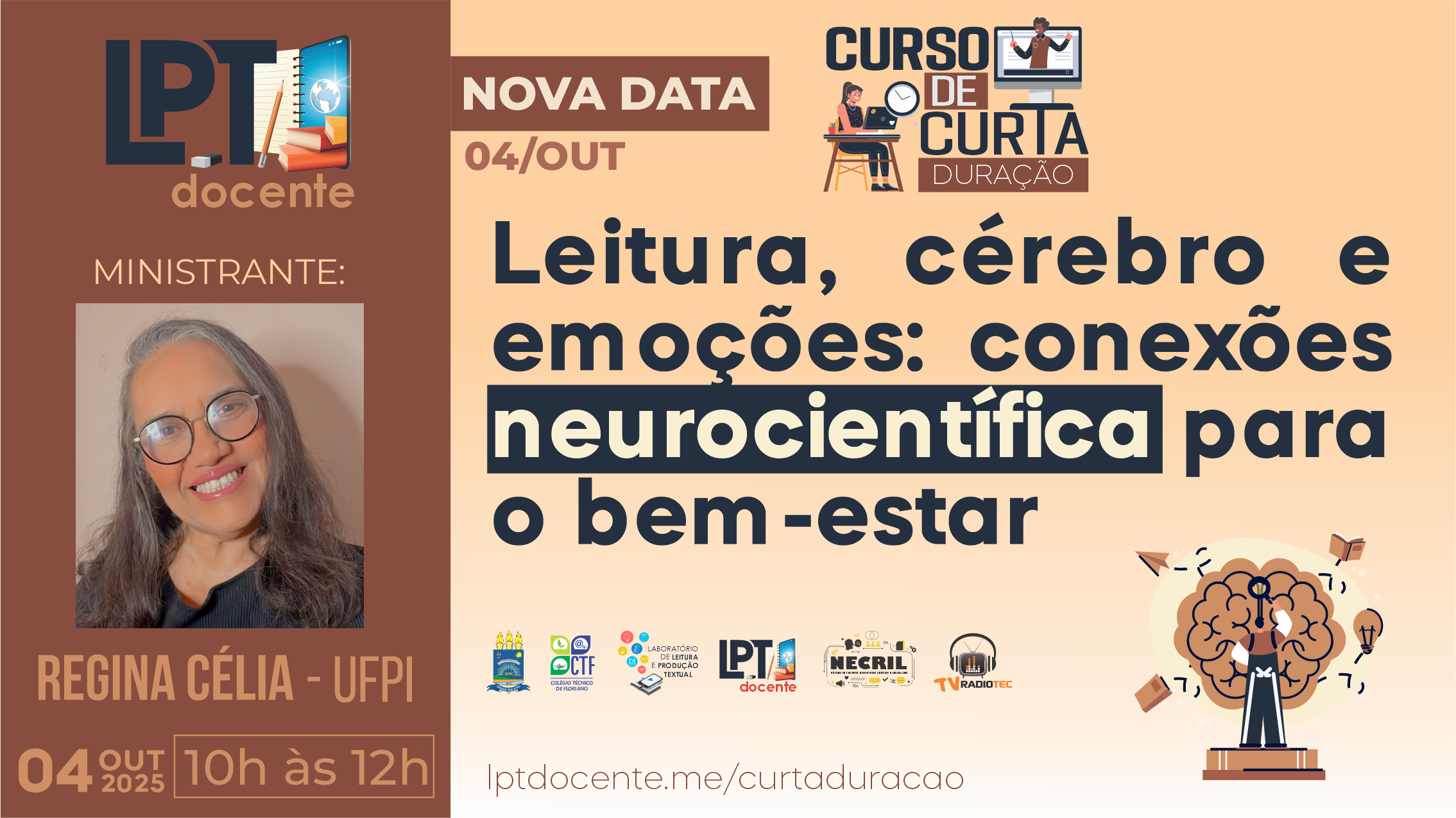 Já o curso Leitura, cérebro e emoções: conexões neurocientíficas para o bem-estar objetiva apresentar os impactos da leitura sobre os processos neuropsicológicos e emocionais, destacando seu papel na promoção da saúde mental e será ministrado pela professora Regina Célia da Silva (UFPI), em turma única e com vagas ilimitadas. As atividades serão realizadas no canal da TV Radiotec no YouTube, conforme dia e horário descritos no cartaz a seguir: