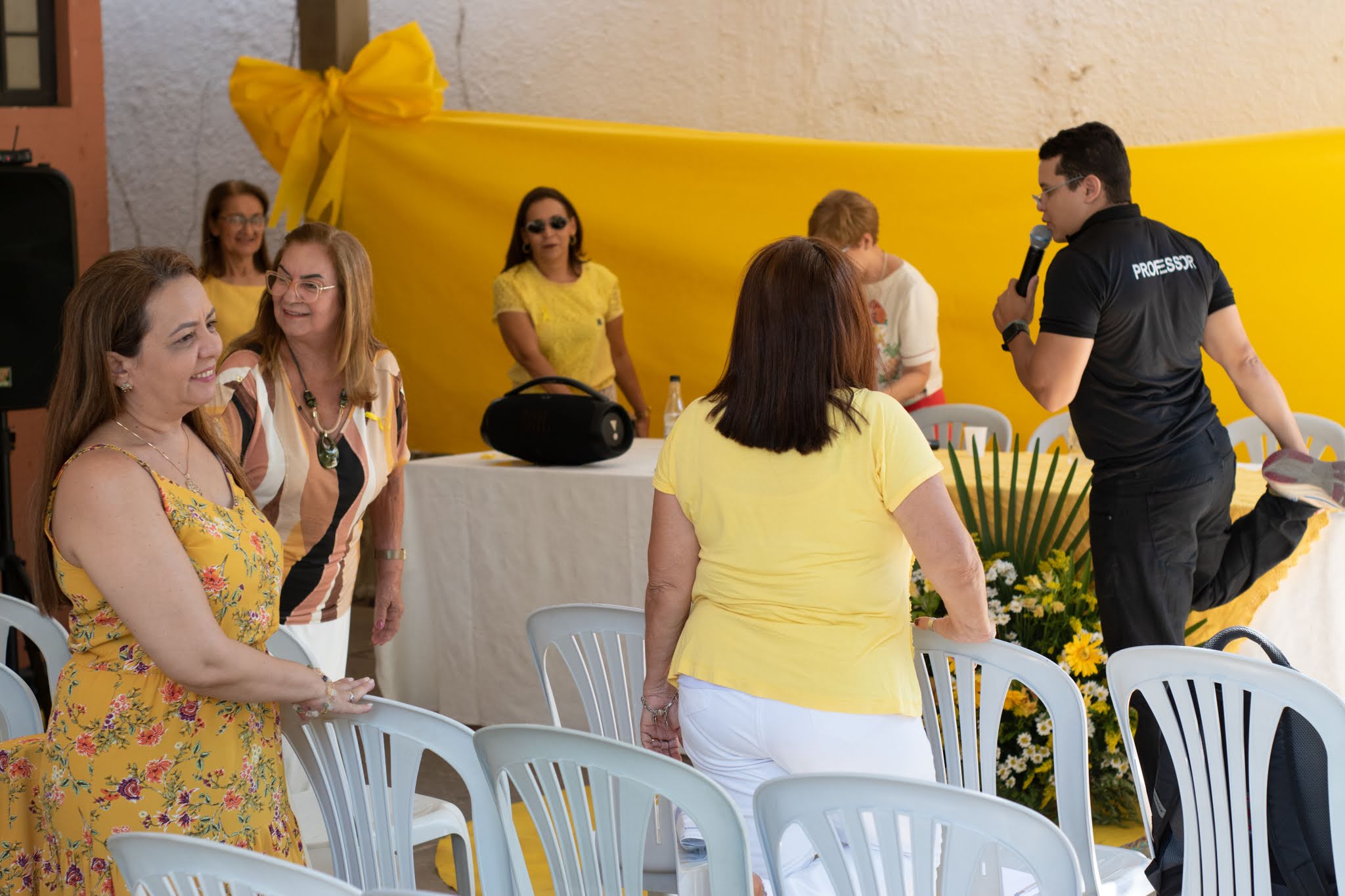 O professor Mateus Ibiapina foi responsável por movimentar o público com música e alongamentos, promovendo descontração, risadas e um momento de integração entre os participantes.