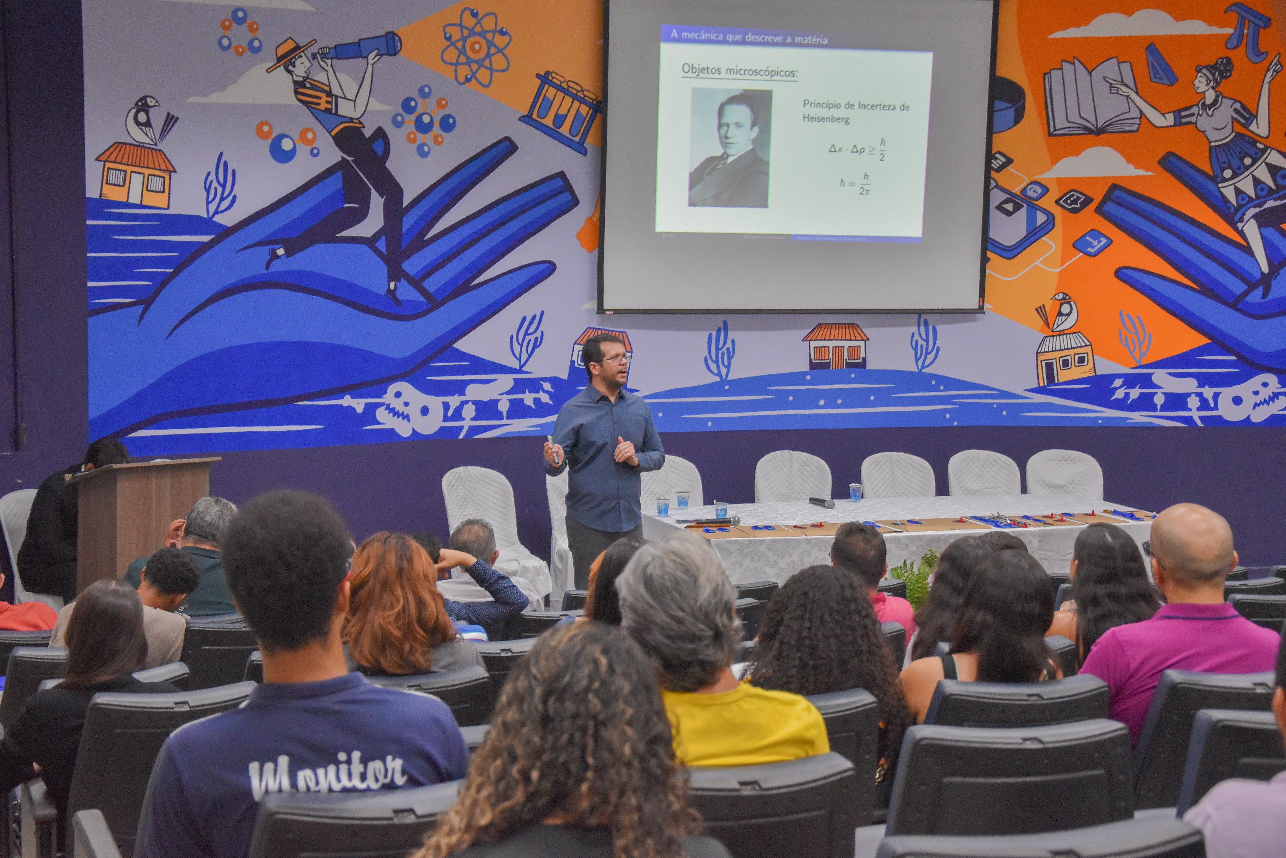 A solenidade contou ainda com a palestra “Átomos: das estrelas à nanociência”, ministrada pelo professor Eduardo Costa Girão, que abordou o papel da Física desde a formação do universo até suas aplicações na nanociência.