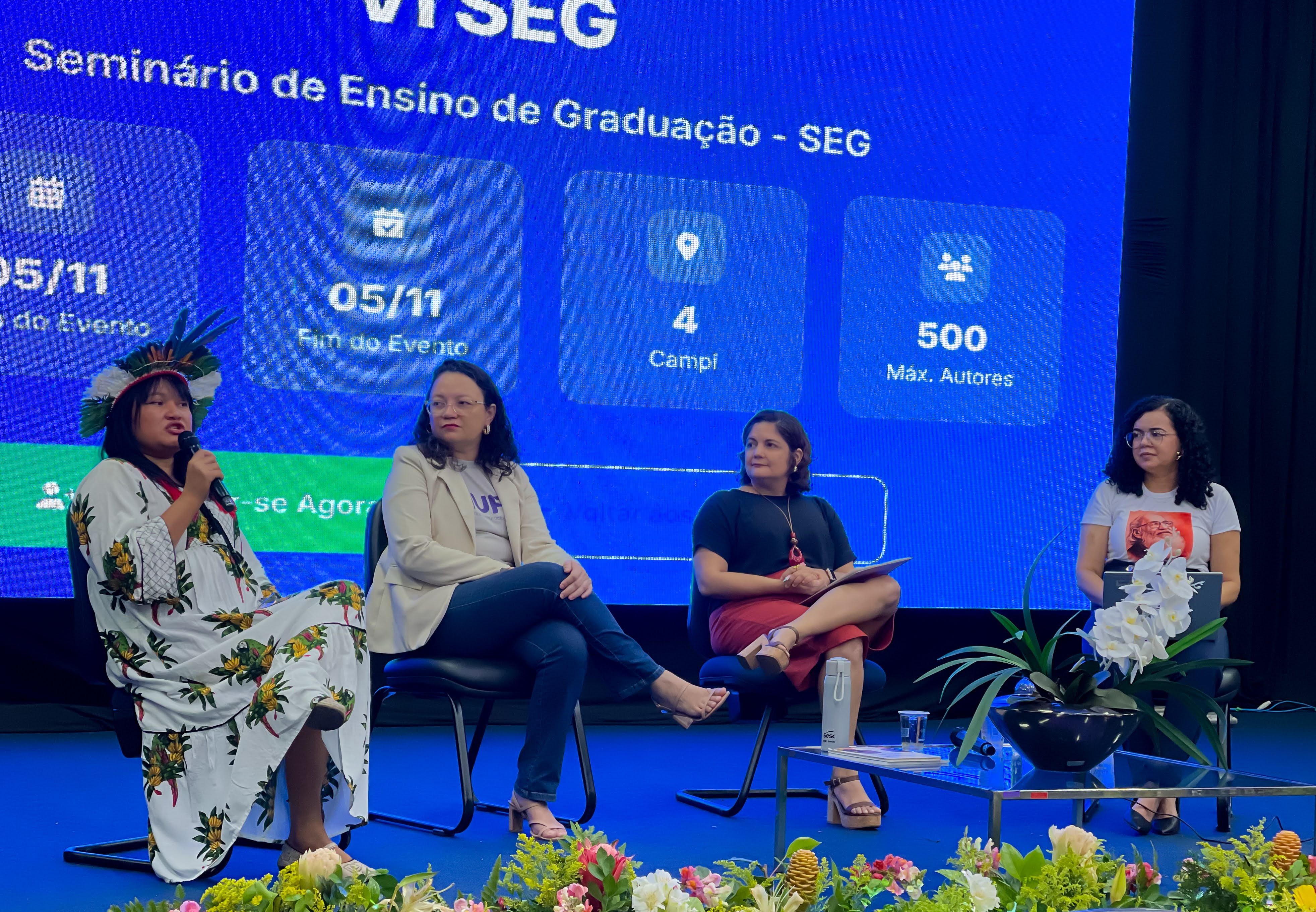 Entre as convidadas do debate, estiveram a Pró-Reitora de Ensino de Graduação, Profa. Gardênia Pinheiro; a Cacica Aliã Wamiri Guajajara, lider indígena na Aldeia Ukair de Teresina, educadora artística e curadora; e a professora Marli Clementino, coordenadora de Graduação da PREG.