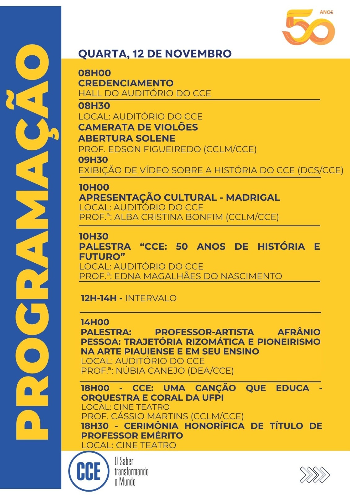 O Centro de Ciências da Educação “Professor Mariano da Silva Neto” da Universidade Federal do Piauí (CCE/UFPI) promove, nos dias 12 e 13 de novembro, uma programação especial em comemoração aos seus 50 anos de criação. As atividades iniciam às 8h, nas dependências do CCE.