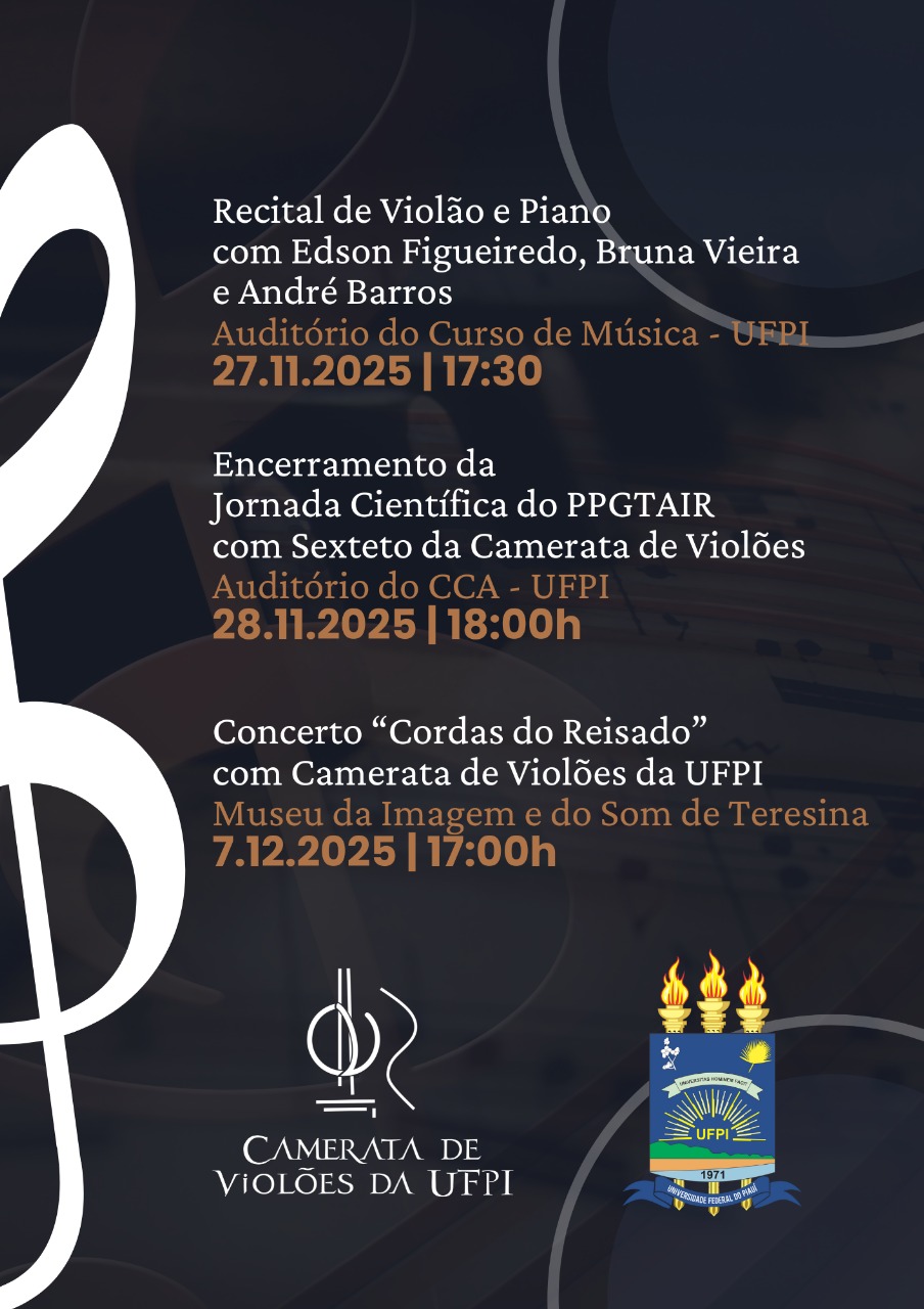 As apresentações ocorrerão em diversos espaços da cidade, como auditórios da UFPI, Escola de Música, Instituto Federal do Piauí (IFPI) e Museu da Imagem e do Som (MIS). Entre os destaques está o concerto “Cordas do Reisado”, que valoriza elementos da cultura popular nordestina, além de recitais em formato de sexteto de violões que integram a programação dos 50 anos do Centro de Ciências da Educação (CCE/UFPI) e o encerramento de eventos científicos da instituição.