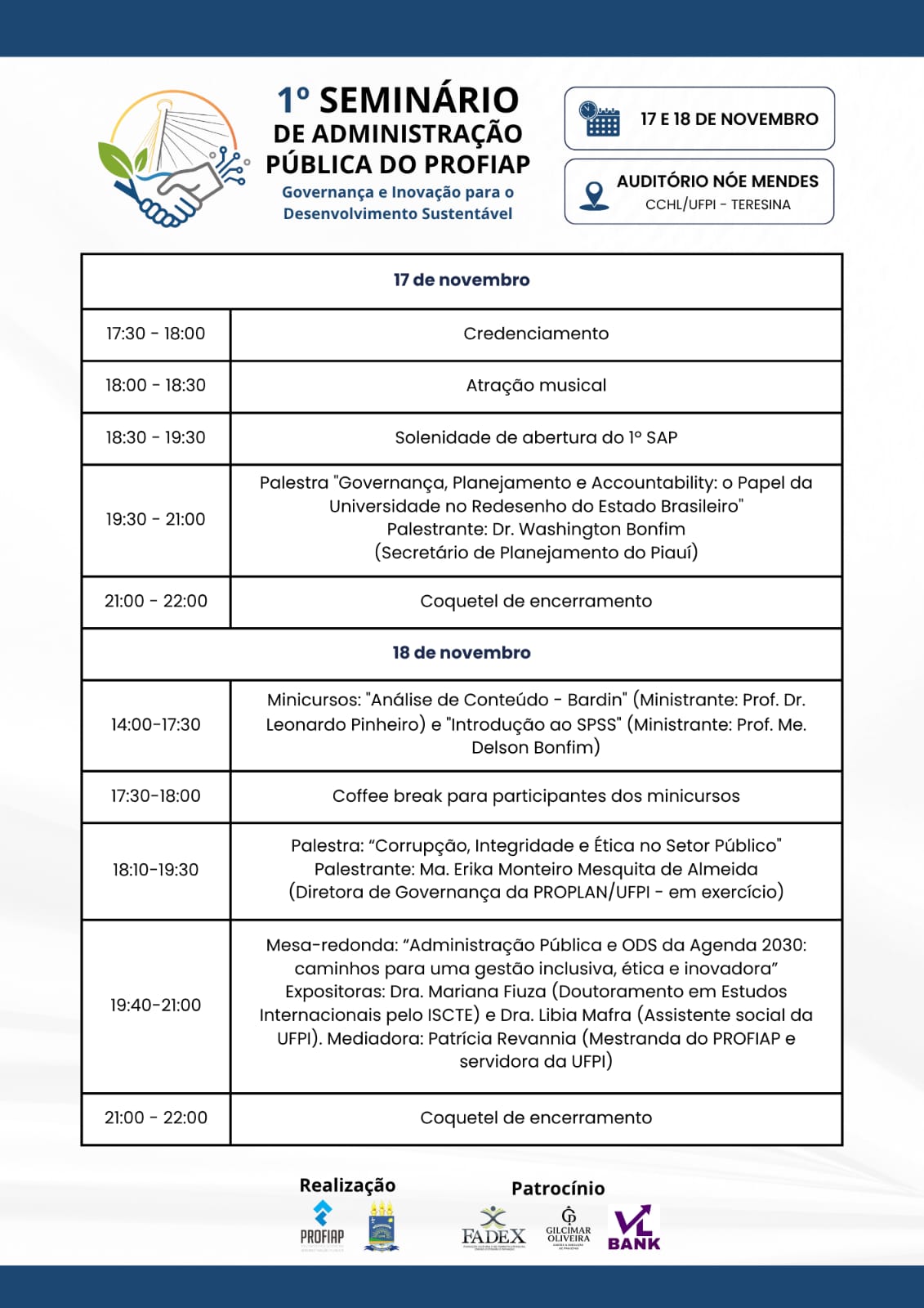 O Programa de Mestrado Profissional em Administração Pública em Rede Nacional da Universidade Federal do Piauí (PROFIAP/UFPI) realiza, nos dias 17 e 18 de novembro de 2025, o 1º Seminário de Administração Pública do PROFIAP/UFPI, que terá como tema “Governança e Inovação para o Desenvolvimento Sustentável”. O evento acontecerá no Auditório Noé Mendes, localizado no Centro de Ciências Humanas e Letras (CCHL/UFPI). Inscreva-se aqui para palestras e mesas-redondas. Minicurso - “Análise de Conteúdo Bardin” com o Prof. Leonardo Pinheiro. Minicurso - Introdução ao SPSS com o Prof. Delson Bonfim.