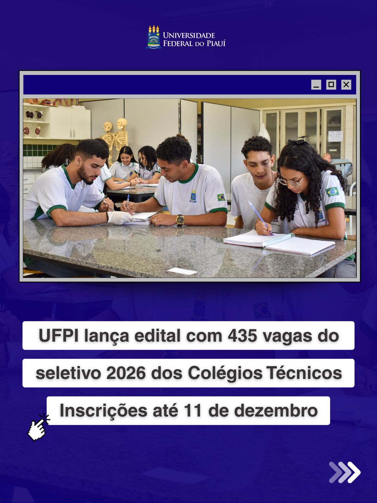 Estarão abertas, a partir das 12h desta segunda-feira (24), as inscrições do processo seletivo para os Colégios Técnicos da Universidade Federal do Piauí (UFPI) nas cidades de Teresina, Floriano e Bom Jesus, para ingresso no ano de 2026. As inscrições serão realizadas exclusivamente via internet pelo site ufpi.br/copese com o prazo final até às 23h59 do dia 11 de dezembro.