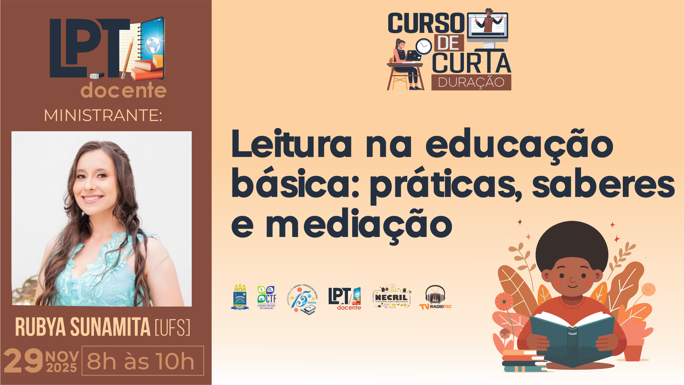 O curso Leitura na educação básica: práticas, saberes e mediação objetiva contribuir para a formação de professores da Educação Básica no planejamento e desenvolvimento de práticas pedagógicas que estimulem a leitura significativa, crítica e prazerosa entre os estudantes, a partir de uma perspectiva de letramento e será ministrado pela estudante Rubya Sunamita Brandão Amorim (UFS), em turma única e com vagas ilimitadas. As atividades serão realizadas no canal da TV Radiotec no YouTube, conforme dia e horário descritos no cartaz a seguir: