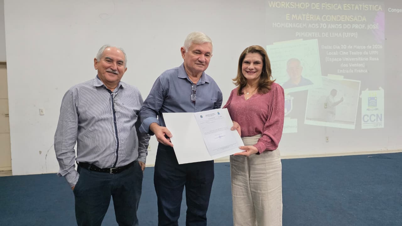 A Universidade Federal do Piauí (UFPI) sediou, na manhã desta sexta-feira (20), no Cine Teatro da instituição, o Workshop de Física Estatística e Matéria Condensada. O objetivo é reunir pesquisadores, docentes, estudantes e colaboradores para a discussão de temas atuais em Física Estatística e Matéria Condensada, ao mesmo tempo em que presta uma homenagem ao professor José Pimentel de Lima, pesquisador, mentor e colega cuja trajetória acadêmica foi decisiva para a construção da Física no Estado do Piauí. Durante a cerimônia, a reitora da UFPI, Nadir Nogueira, fez a entrega do ato de aposentadoria do docente.
