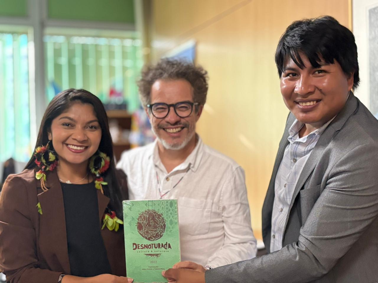 Na foto, os professores Mairton Celestino e Maria do Socorro Arantes e o estudante Seribi Tukano participam de agenda em Brasília (DF) para promoção da educação superior indígena
