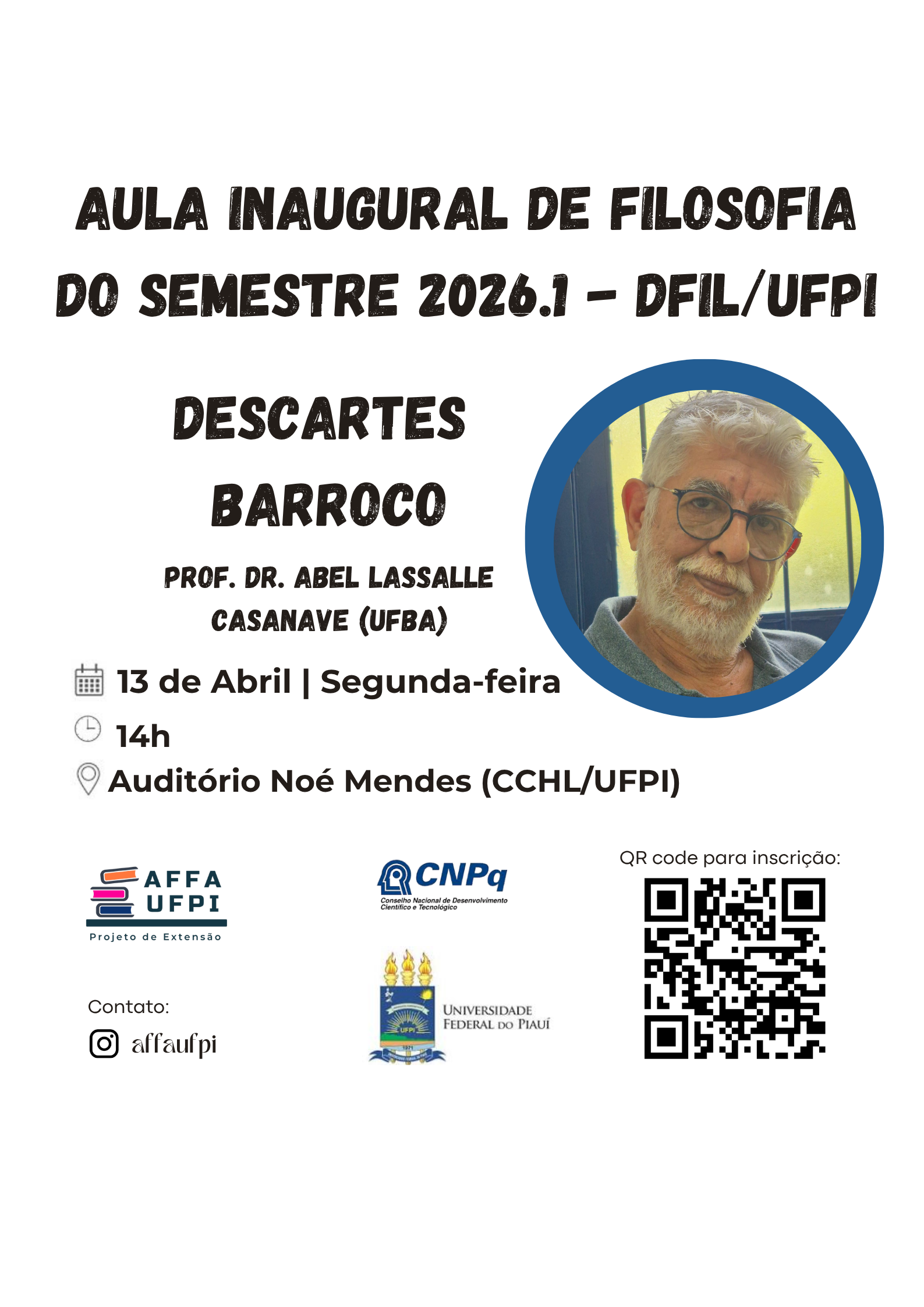 O Departamento de Filosofia da Universidade Federal do Piauí (DFIL/UFPI) realiza, no dia 13 de abril de 2026, a aula inaugural do semestre letivo 2026.1. O evento contará com a palestra “Descartes Barroco”, ministrada pelo professor convidado professor Abel Lassalle Casanave, da Universidade Federal da Bahia (UFBA).