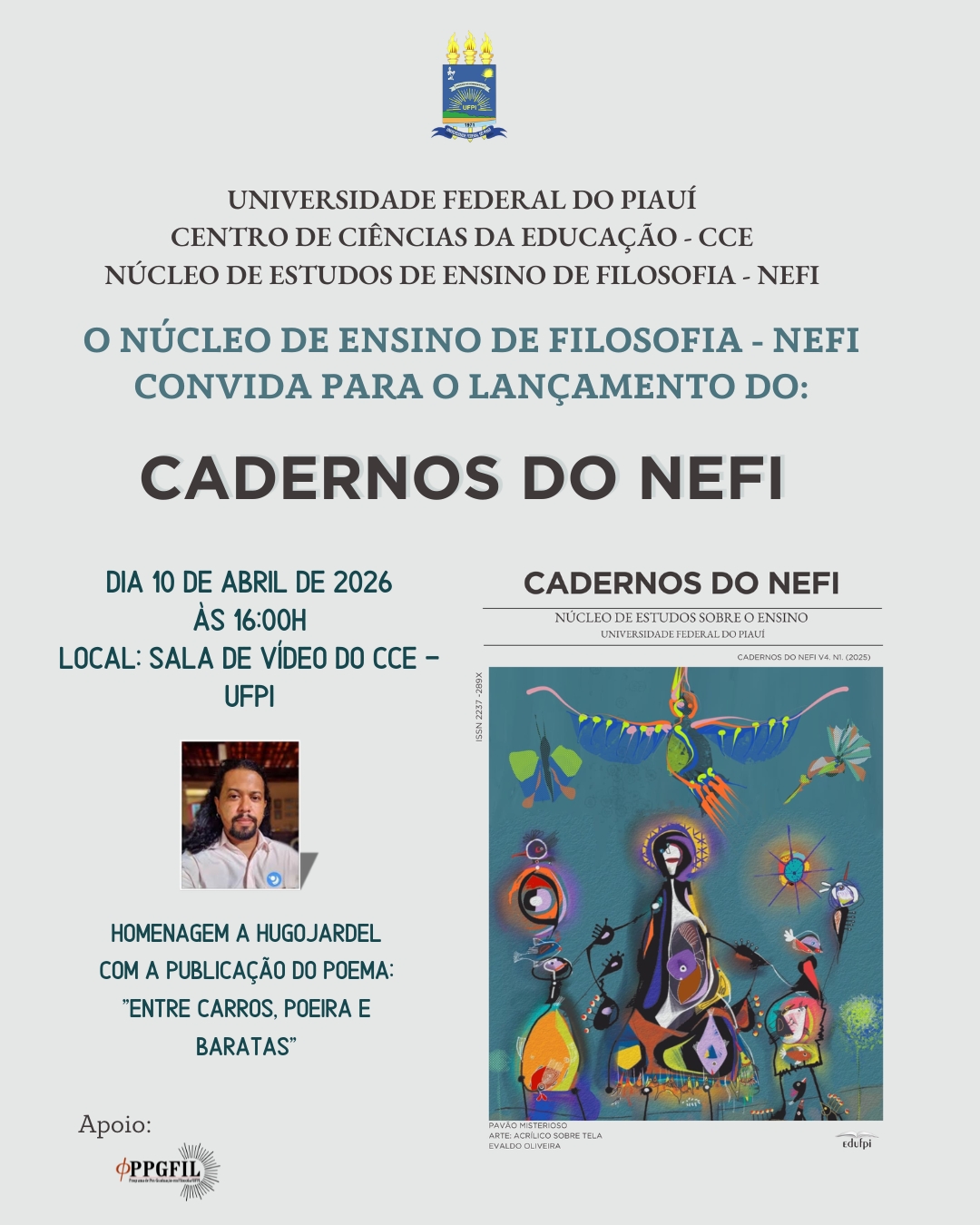 O Núcleo de Estudos sobre Ensino de Filosofia (NEFI) da Universidade Federal do Piauí (UFPI) lança nesta sexta-feira, 10 de abril, o volume 4 da revista Cadernos do NEFI. O evento ocorre, às 16h, na sala de vídeo do Centro de Ciências da Educação (CCE), no campus de Teresina.