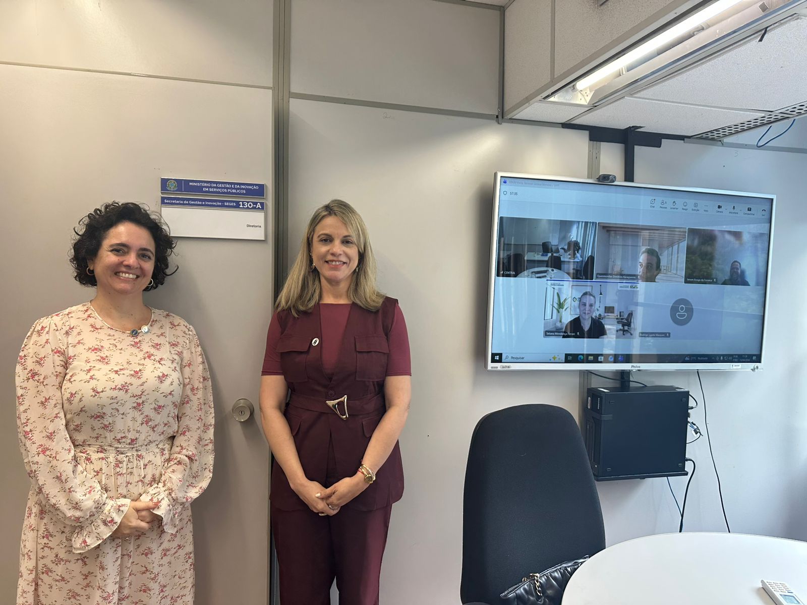 Em ocasião de reunião na Central de Compras do MGI. Na foto, a pró-reitora Larissa Mendes ao lado da coordenadora-geral de Estratégias de Aquisições e Contratações do MGI, Eleni Roberta da Silva