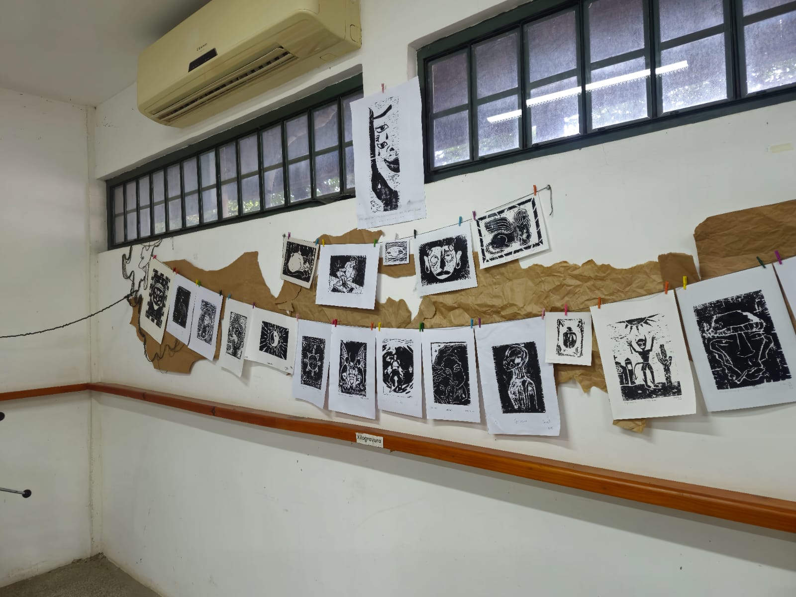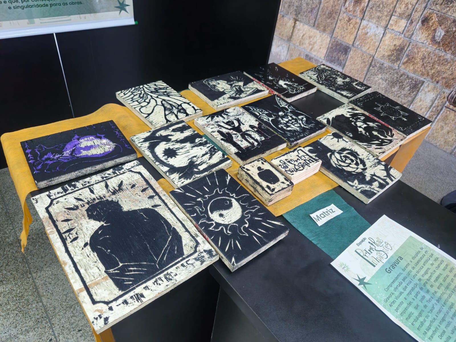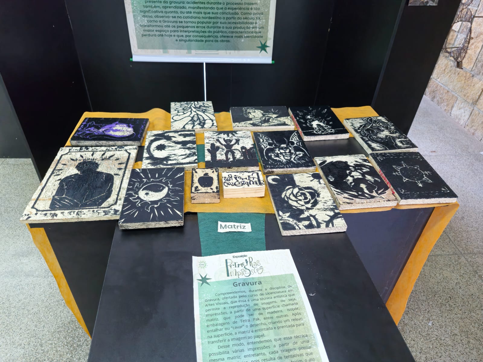 A estudante Janiele Alves Costas, que integra a comissão da exposição, ressalta o esforço por trás da atividade. “A construção da exposição é feita de estações para fazer com que a experiência seja mais imersiva. A primeira estação é feita pelas matrizes de madeira. Ao dar continuidade o espectador encontra fotos das nossas aulas, das nossas práticas e também dos materiais que utilizamos. No segundo espaço ficam os trabalhos finalizados. Nas paredes, as obras das técnicas de isogravura, calcogravura e xilogravura, penduradas em varal, fazendo menção ao cordel nordestino”, explica.