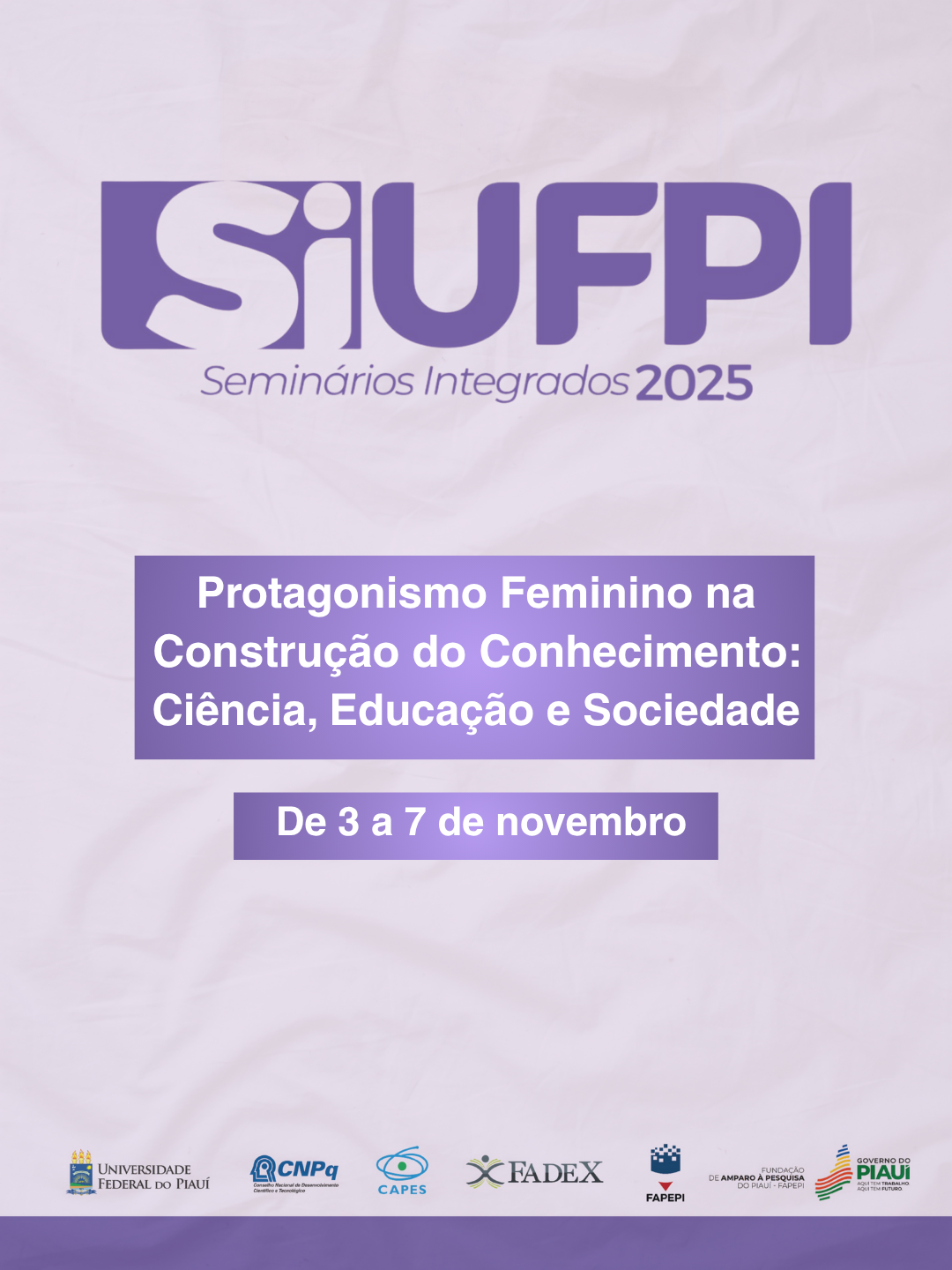 Com o tema “Protagonismo feminino na construção do conhecimento: Ciência, Educação e Sociedade”, os Seminários Integrados da Universidade Federal do Piauí (SIUFPI) acontecem de 3 a 7 de novembro, em todos os campi da multicampia da Instituição. Como o maior evento acadêmico da Universidade Federal do Piauí (UFPI), os SIUFPI possibilitam a produção e a disseminação do conhecimento por meio de trabalhos desenvolvidos por estudantes, docentes, pesquisadoras e pesquisadores. Inscreva-se no SIUFPI aqui.