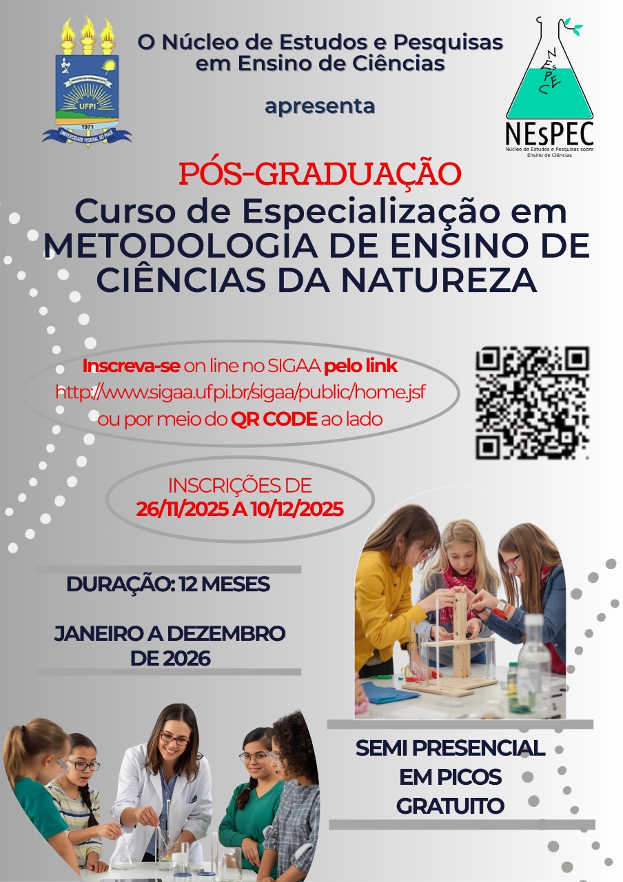 A Universidade Federal do Piauí (UFPI) informa que estão abertas, de 26 de novembro a 10 de dezembro de 2025, as inscrições para o Curso de Especialização em Metodologia de Ensino de Ciências da Natureza, organizado pelo Núcleo de Estudos e Pesquisas sobre Ensino de Ciências (NEsPEC) e coordenado pelo professor Fábio Soares da Paz.