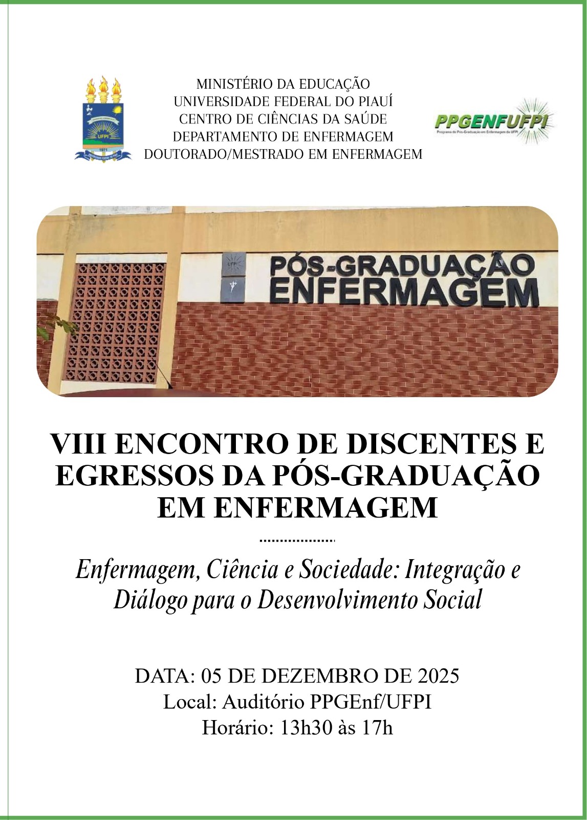 A Universidade Federal do Piauí (UFPI), por meio do Programa de Pós-Graduação em Enfermagem (PPGENF), realiza o VIII Encontro de discentes e egressos do Programa de Pós-Graduação em Enfermagem, na sexta-feira (5), a partir das 14h, no auditório professora Benevina Nunes. O evento acontece em homenagem aos 18 anos da formação do programa.