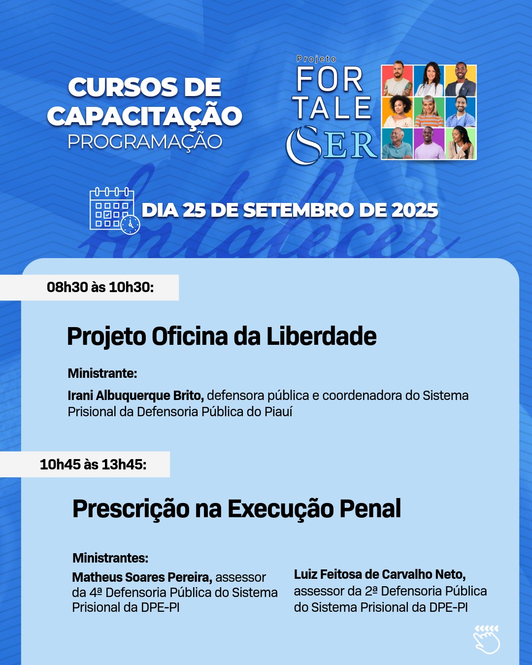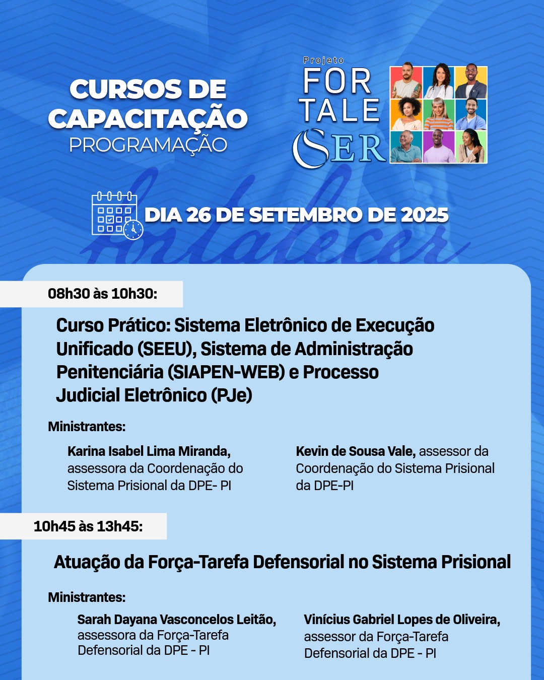 A Universidade Federal do Piauí (UFPI) e a Defensoria Pública do Estado do Piauí (DPE-PI) realizam, nos dias 25 e 26 de setembro, a capacitação do Projeto Fortalecer, no Auditório Esperança Garcia, em Teresina. As inscrições estão abertas e podem ser feitas aqui.