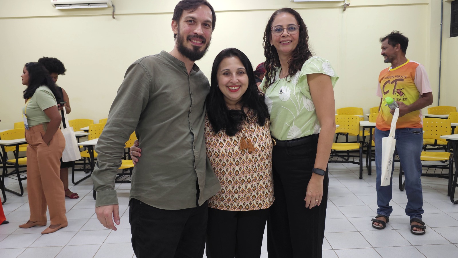 Na foto, a pró-reitora da PREXC, ao lado da coordenadora de Cultura da PREXC, Waleska Albuquerque; e do produtor cultural da PREXC, Augusto Dantas