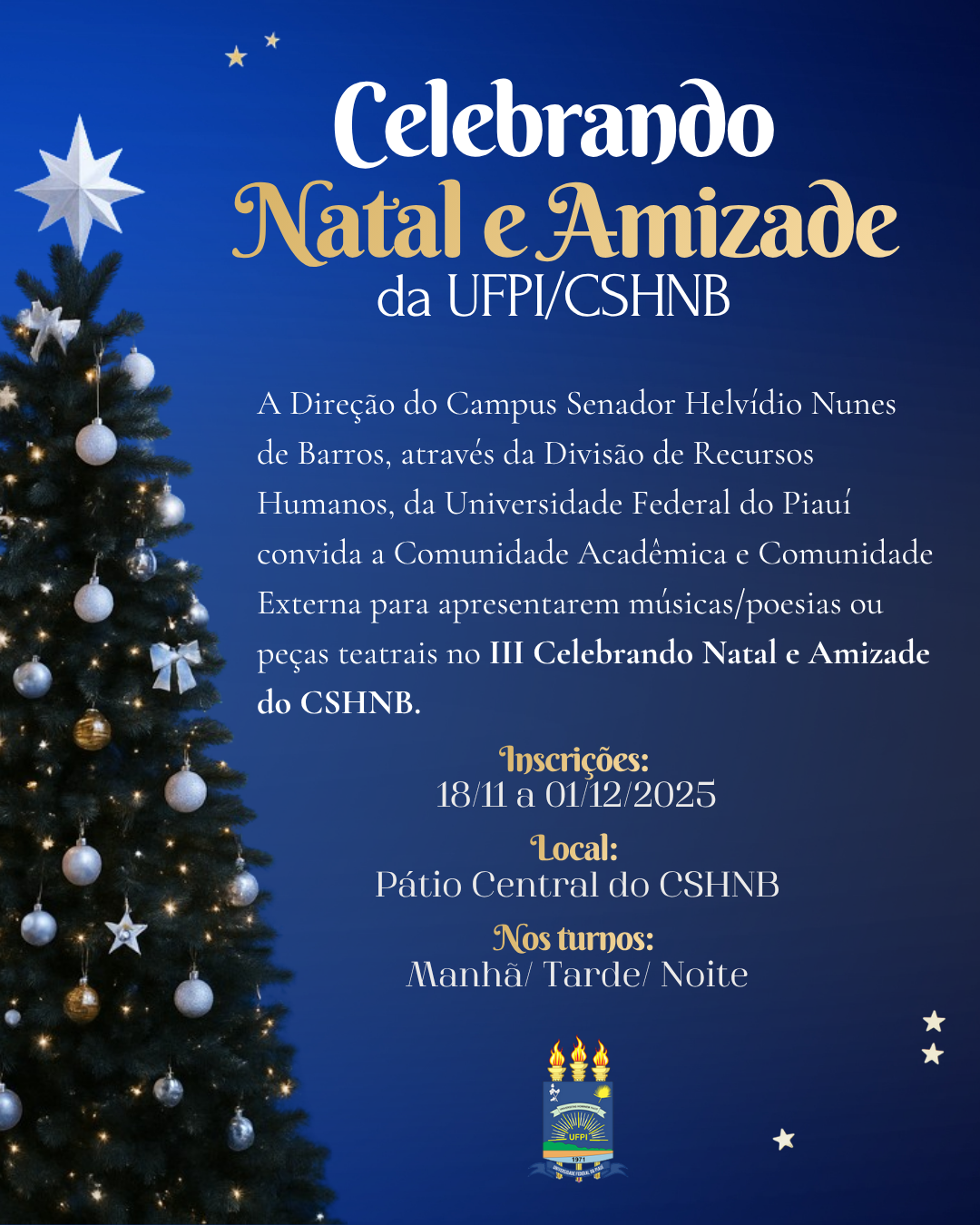 Estão abertas, até o dia 2 de dezembro de 2025, as inscrições para o evento “III Celebrando: Natal e Amizade – CSHNB”, evento este que faz parte do Programa de Qualidade de Vida no Trabalho (QVT) do CSHNB/UFPI. As inscrições devem ser realizadas pelo SIGAA: SIGAA > Extensão > Acesso à área de inscritos em Cursos e Eventos. Serão disponibilizadas 60 vagas, sendo 30 para o público interno (docentes, discentes e técnicos) e 30 para a comunidade externa. O evento será presencial, com carga horária total de 8 horas. A programação ocorrerá no dia 3 de dezembro de 2025, nos turnos da manhã, tarde e noite, no Pátio Central e no Auditório do CSHNB. O festival contará com apresentações musicais e artísticas de servidores, estudantes da UFPI e membros da comunidade externa. A comunidade interna e externa também poderá se inscrever para realizar apresentações artísticas, por meio do formulário: Inscrição para apresentações. Neste ano, o evento é realizado em parceria com o projeto de extensão “Conexão UFPI: Conhecendo o Campus Senador Helvídio Nunes de Barros”, coordenado pela servidora Francisca Nilcélia Macedo Barroso , reforçando o compromisso de integrar a universidade à comunidade e valorizar a troca de saberes. O festival tem como objetivo promover o diálogo e a apreciação de atividades artísticas, incluindo música, teatro e outras expressões culturais, celebrando a amizade entre servidores, estudantes e a comunidade externa. A programação contará com músicas natalinas e canções que exaltam a amizade, fortalecendo vínculos e promovendo momentos de confraternização. Além disso, o evento está alinhado ao eixo de Qualidade de Vida no Trabalho (QVT), utilizando a música e a arteterapia como ferramentas de promoção da saúde mental e do bem-estar. A prática artística contribui tanto para a prevenção quanto para a recuperação da saúde emocional, proporcionando experiências terapêuticas e prazerosas aos participantes. A organização convida toda a comunidade acadêmica e externa a participar deste momento especial de celebração e convivência, marcado pelas tradições natalinas e pela comemoração do nascimento de Jesus Cristo segundo a tradição cristã.