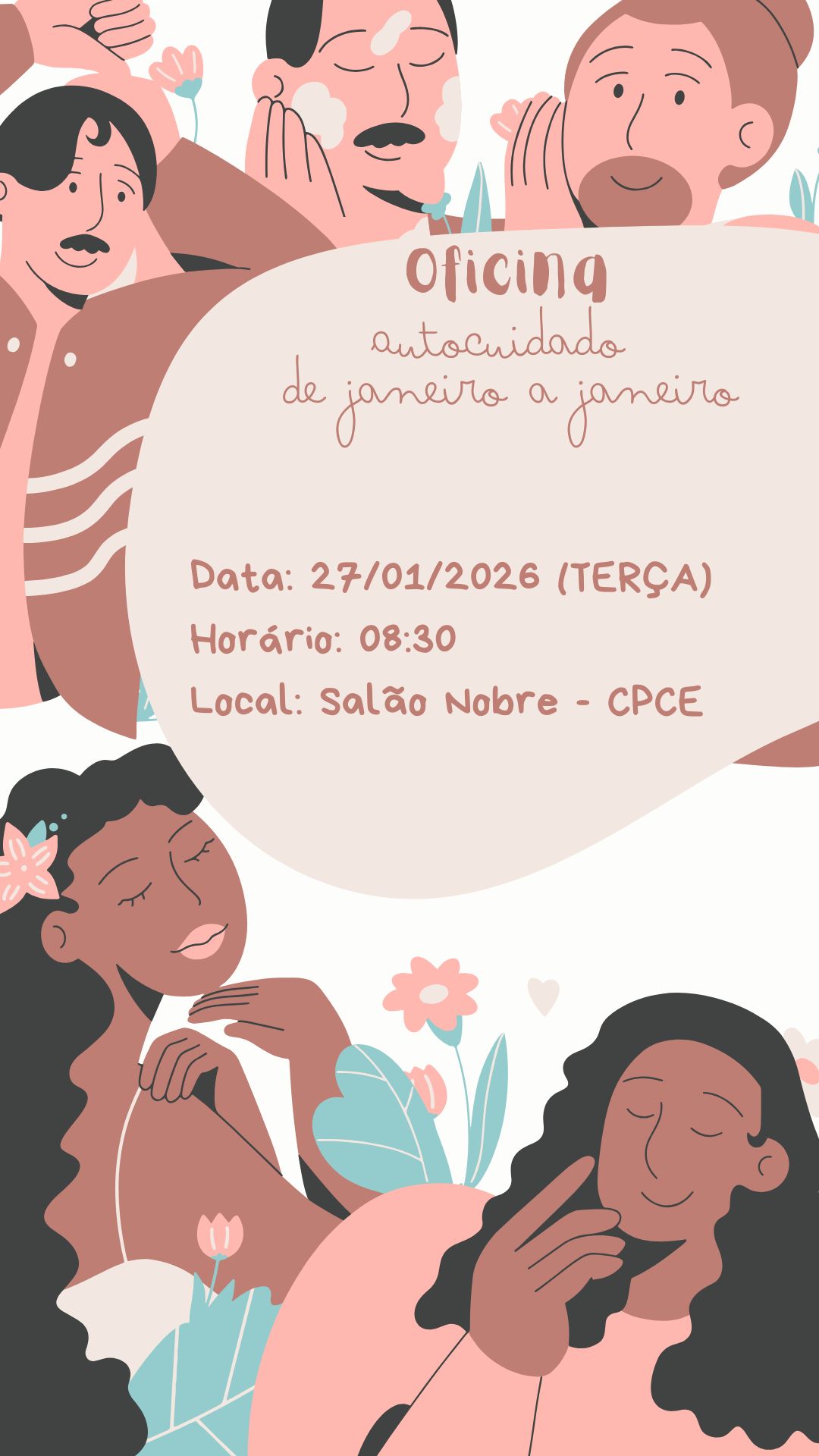 Pensando nisso o CPCE convida os(as) servidores(as) e trabalhadores(as) terceirizados(as) para participarem da Oficina “Autocuidado: de janeiro a janeiro”, uma ação voltada à promoção da saúde, do bem-estar e do cuidado consigo ao longo do ano, que será realizada no dia 27 de janeiro de 2026 (terça-feira), as 08h30, no Salão Nobre (ao lado da direção do Campus).