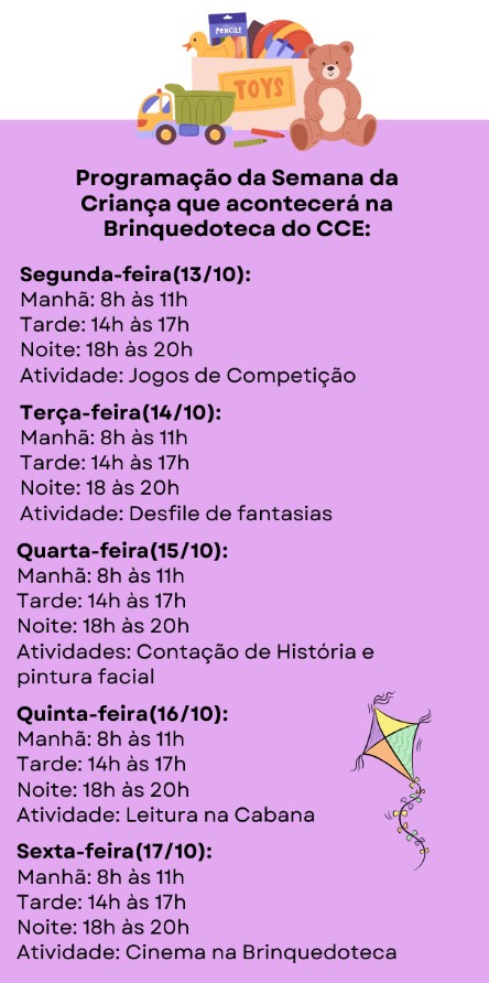 Será realizado no período de 13 a 17 de outubro, no Centro de Ciências da Educação, a Semana da Criança. Serão atividades direcionadas às crianças, filhos e filhas de discentes e servidores da UFPI.