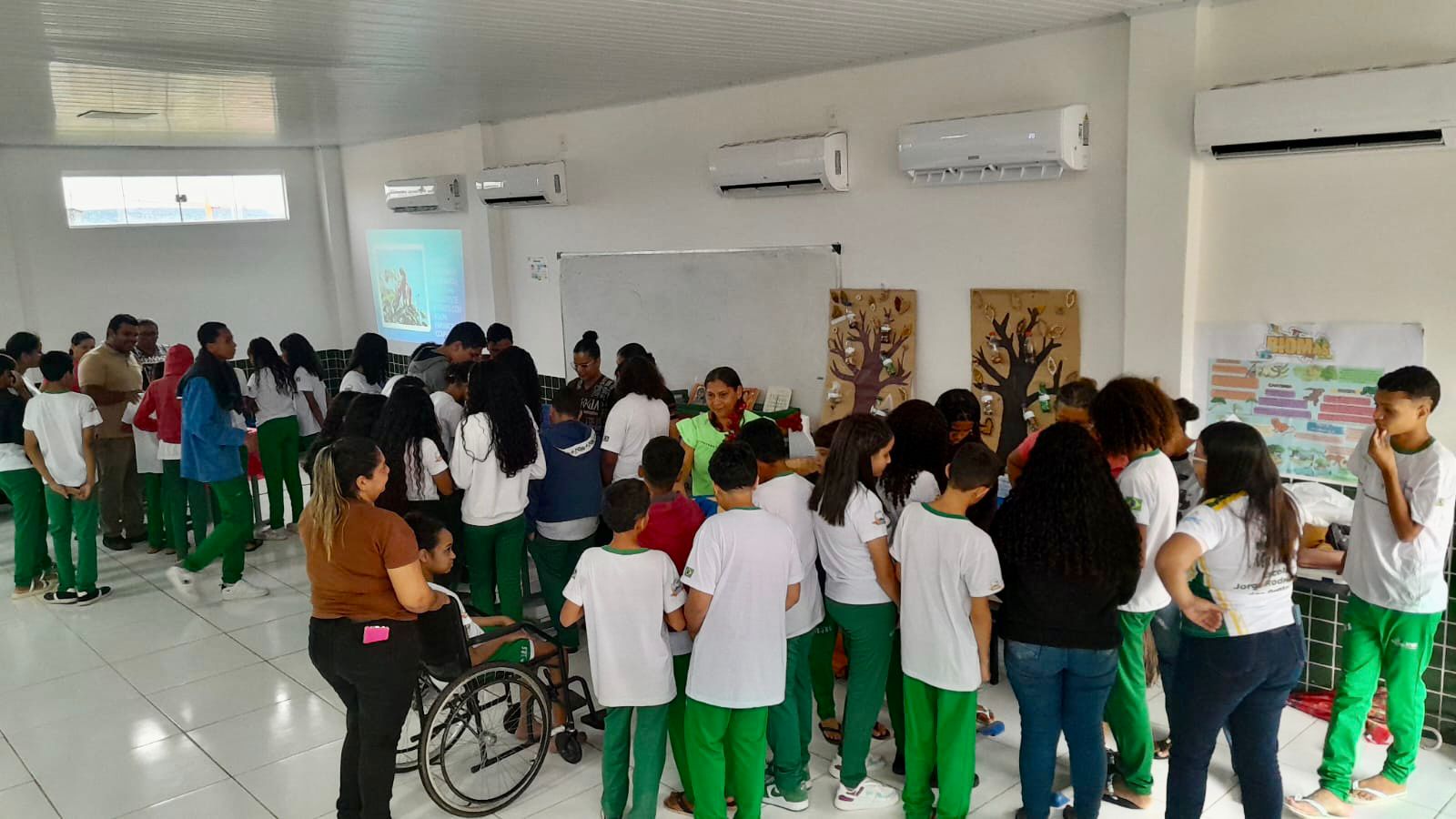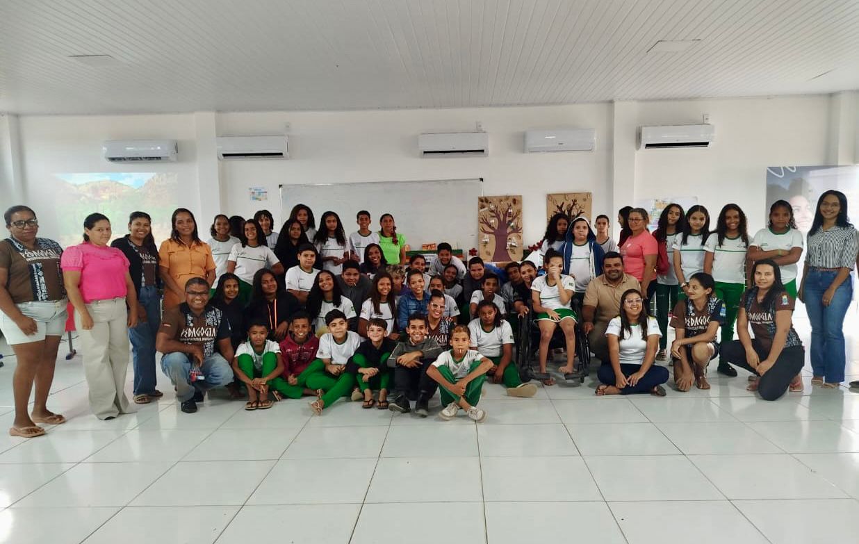 Cursistas de Pedagogia Intercultural Indígena com alunos da Unidade Escolar Jorge Rodrigues dos Santos