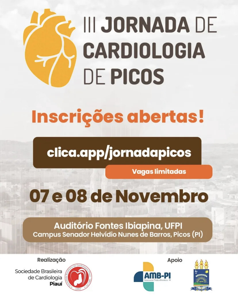 A Universidade Federal do Piauí (UFPI), por meio do Campus Senador Helvídio Nunes de Barros (CSHNB), sediará nos dias 7 e 8 de novembro de 2025 a III Jornada de Cardiologia de Picos, evento promovido em parceria com a Sociedade Brasileira de Cardiologia – Seção Piauí (SBC-PI). As atividades acontecerão no Auditório Fontes Ibiapina, reunindo especialistas, docentes e estudantes da área da saúde para debater os mais recentes avanços na cardiologia. Inscreva-se aqui.