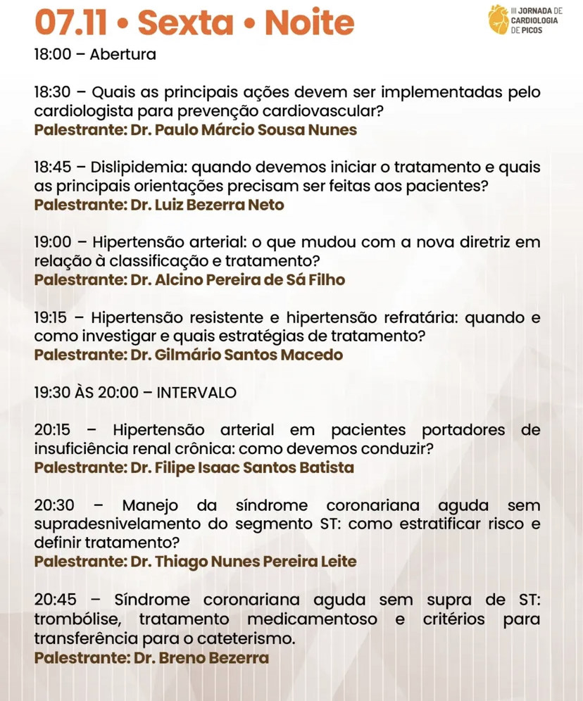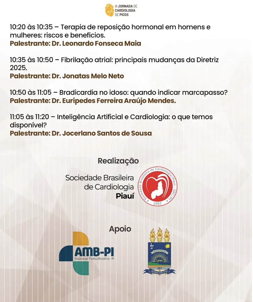 A Jornada tem como objetivo promover a atualização científica, a integração e a troca de experiências entre profissionais e acadêmicos, consolidando-se como um dos principais espaços de educação médica continuada no interior do Estado. A iniciativa conta com o apoio da Liga Acadêmica de Cardiologia da UFPI/CSHNB, da Sociedade Brasileira de Cardiologia – PI e da Associação Médica Brasileira (AMB).