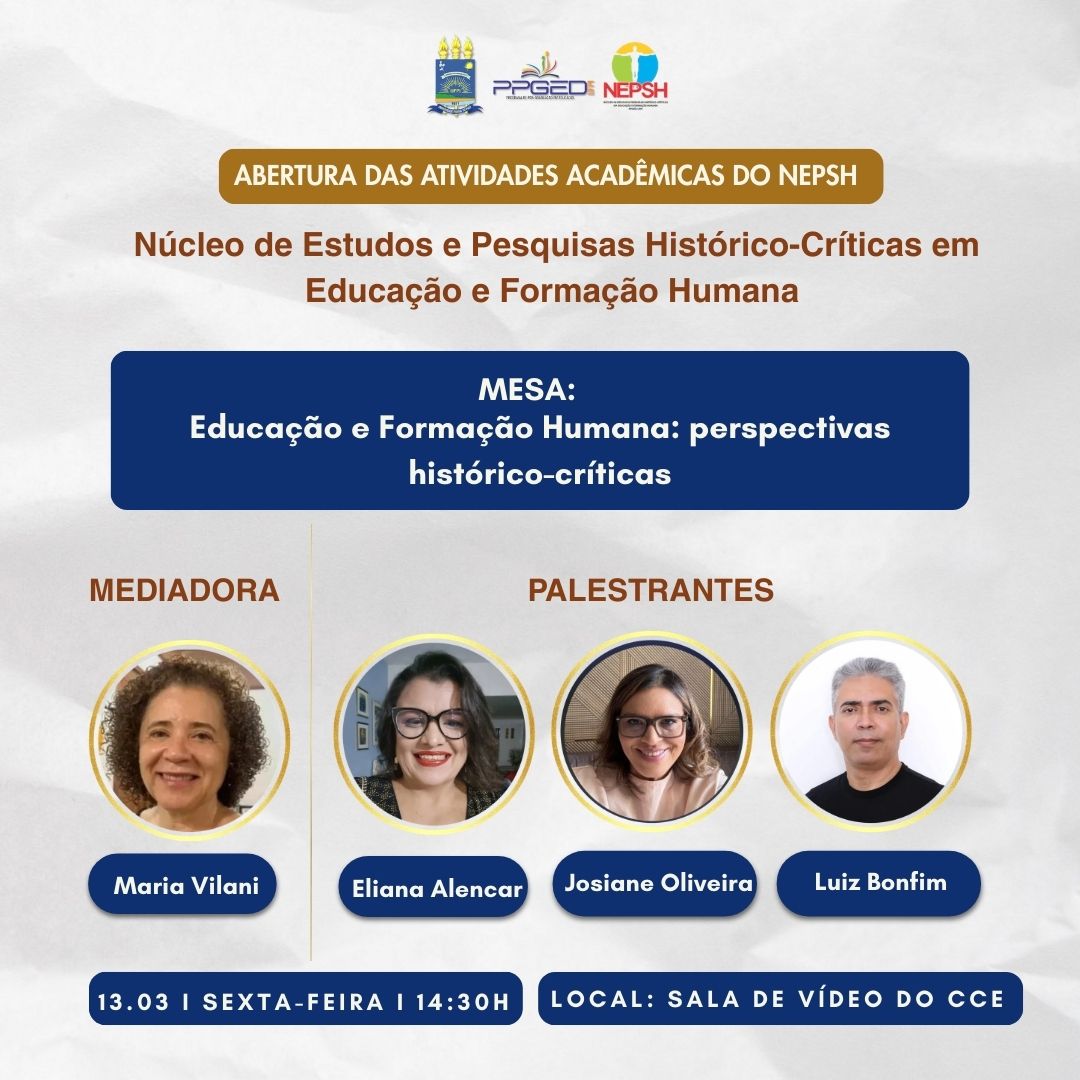 O Núcleo de Estudos e Pesquisas Histórico-Críticas em Educação e Formação Humana (NEPSH), realizará no dia 13 de março (sexta-feira) a abertura das atividades acadêmicas do ano de 2026 com a mesa intitulada "Educação e Formação Humana: perspectivas histórico-críticas".