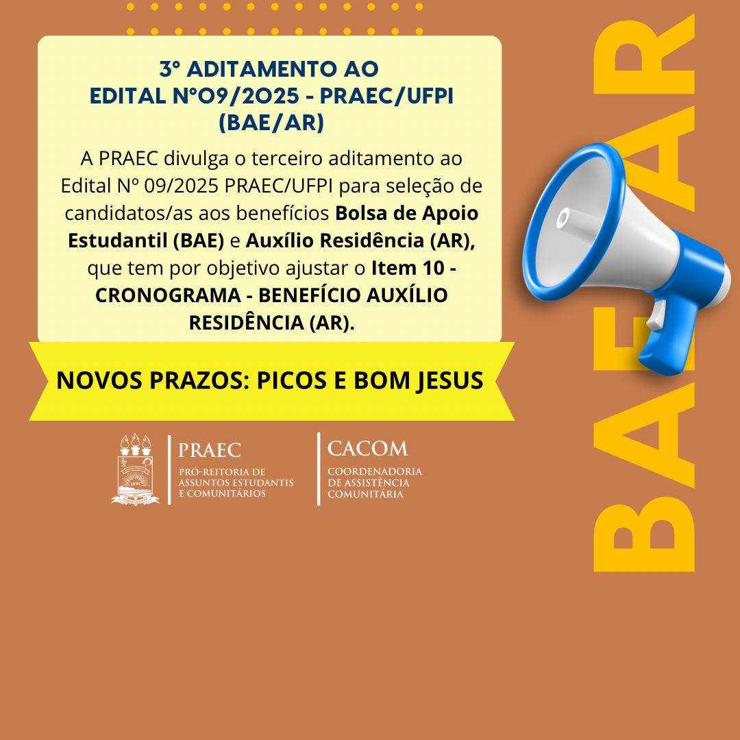 CACOM/PRAEC divulga o terceiro aditamento ao Edital Nº 09/2025 - PRAEC/UFPI de seleção de estudantes para os benefícios Bolsa de Apoio Estudantil (BAE) e Auxílio Residência (AR)