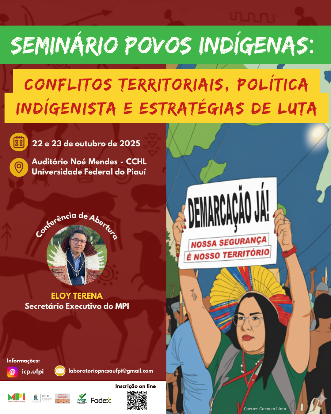 Temos a satisfação de convidar a comunidade acadêmica e a sociedade em geral para participar do Seminário Povos Indígenas: Conflitos Territoriais, Política Indigenista e Estratégias de Luta, que será realizado nos dias 22 e 23 de outubro de 2025, no Auditório Noé Mendes, do CCHL/UFPI.