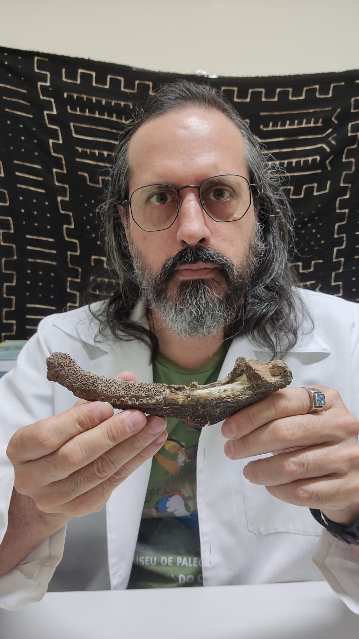 Professor Juan Carlos Cisneros com mandíbula do anfíbio descoberto