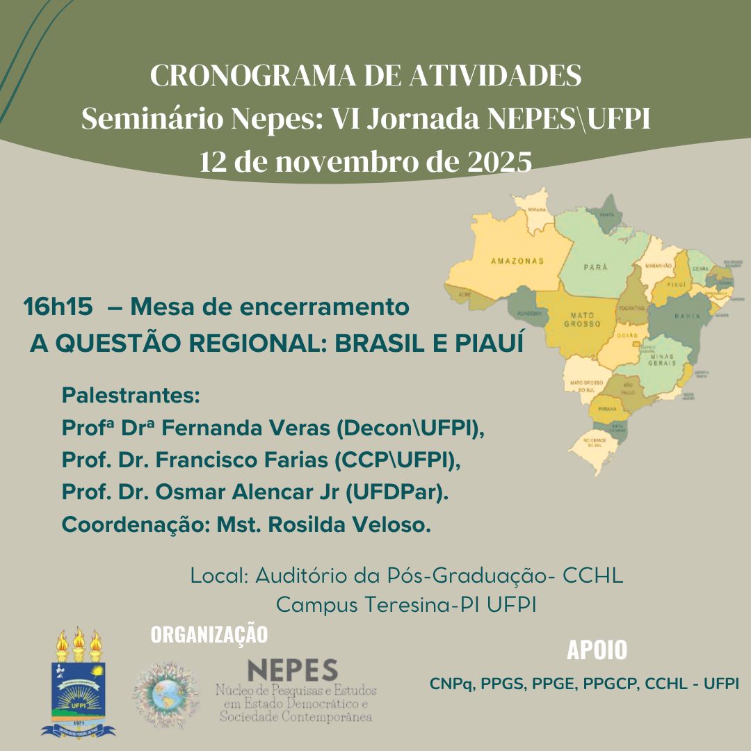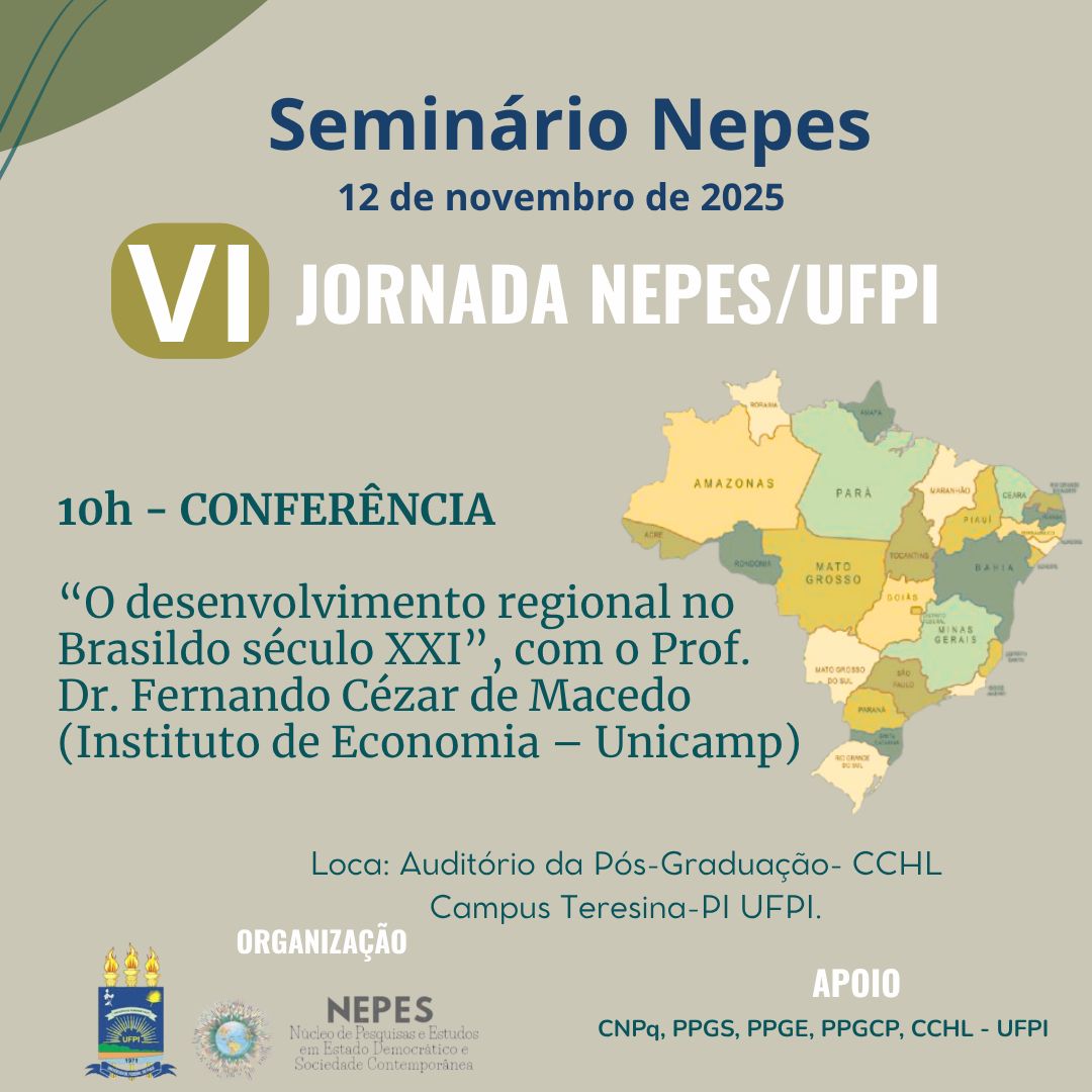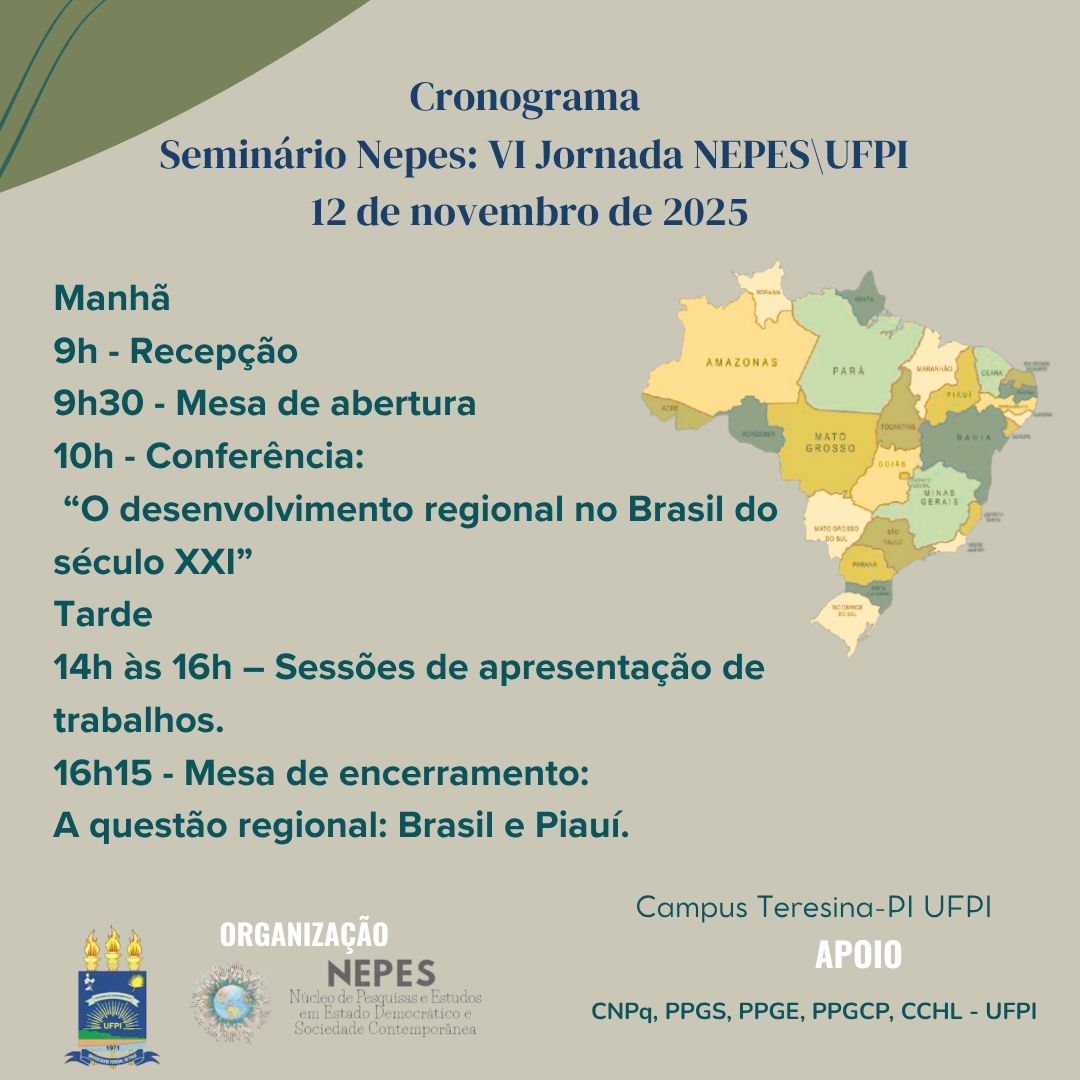 O Núcleo de Pesquisa Estado Democrático e Sociedade Contemporânea (NEPES), da Universidade Federal do Piauí (UFPI), realiza, no dia 12 de novembro, a VI Jornada NEPES/UFPI, no Auditório da Pós-Graduação do Centro de Ciências Humanas e Letras (CCHL), no Campus de Teresina.